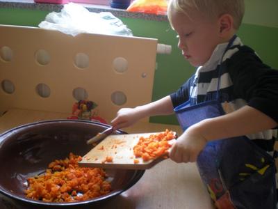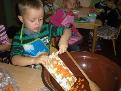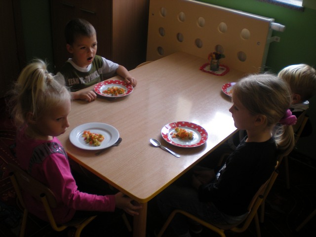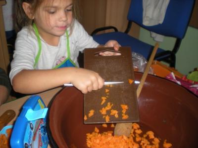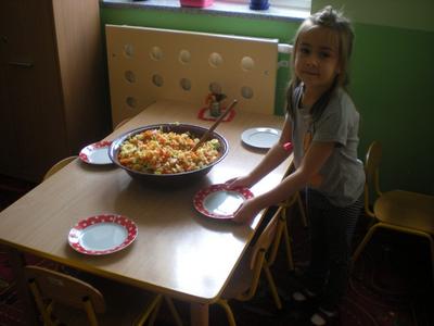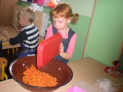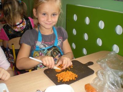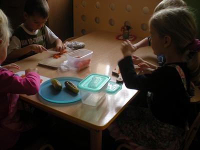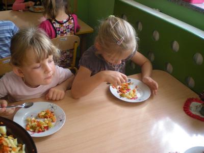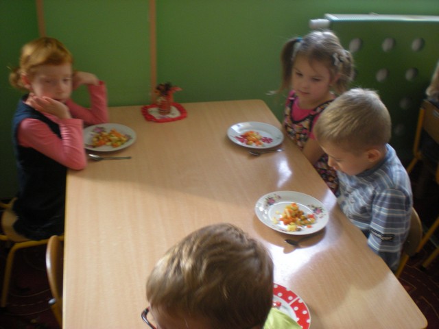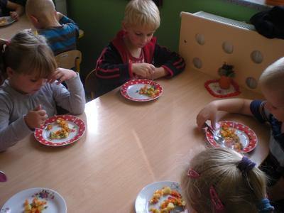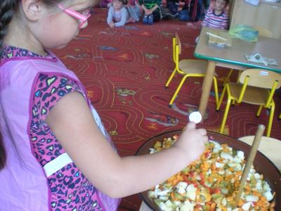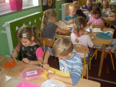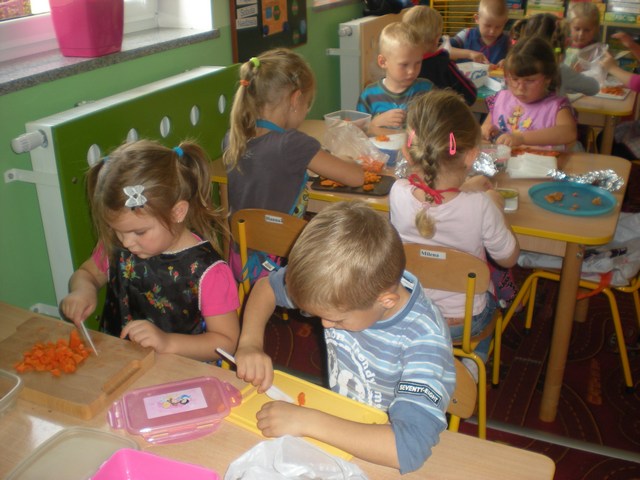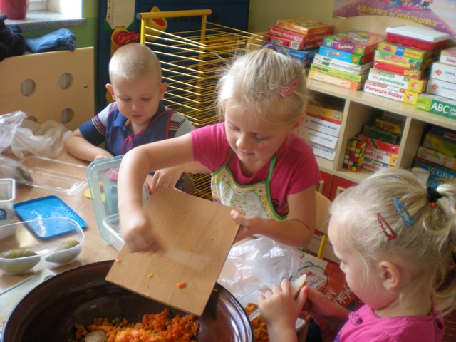 Dzisiejszy poranek w grupie najstarszej był niezwykły. Tego październikowego dnia dzieci przyniosły ze swojego domu niezbędne składniki do przygotowania sałatki jarzynowej. Po dokładnym umyciu rąk, założeniu fartuszków kuchennych czas było rozpocząć krojenie warzyw. Dzieci doskonale wiedziały jak należy posługiwać się nożem co widać na załączonych poniżej zdjęciach. Po doprawieniu sałatki sola i pieprzem czas było spróbować niezwykłej sałatki w wykonaniu,,Misiaków''. Sałatka wszystkim smakowała.