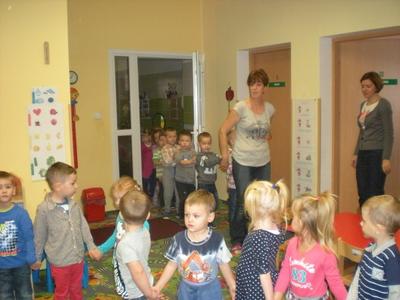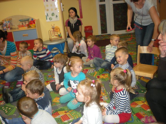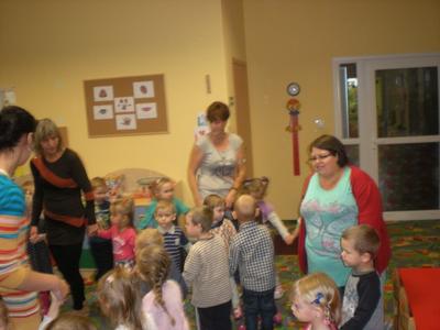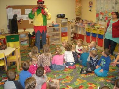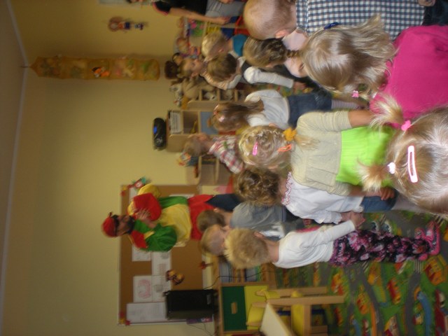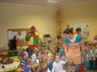 W jesienny listopadowy poranek (13 listopada 2014r.) dzieci z naszego przedszkola zapamiętają na długo. Tego dnia przedszkole odwiedził błazen (rodzaj klauna) który to kiedyś za czasów średniowiecza służył na dworach. Charakterystycznym elementem błazna jest czapka o trzech rogach zakończona dzwoneczkami oraz kolorowy strój. Gość zabrał dzieci do krainy czarodziejskich bajek. Były tańce, wspólne śpiewy oraz zagadki związane z tematyką jesienną. Nawet w smutny jesienny poranek, kiedy nie widać słońca za oknem w naszym przedszkolu można świetnie się bawić. Wszystkim dopisywał dobry humor do końca dnia.
