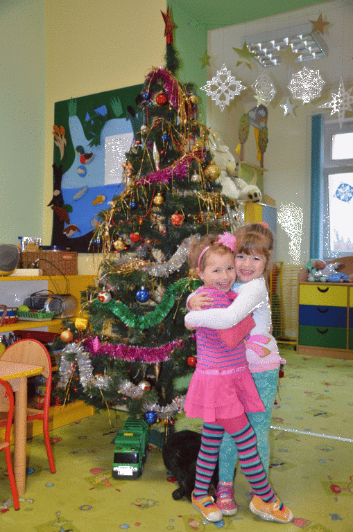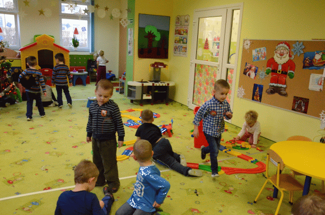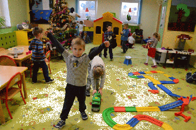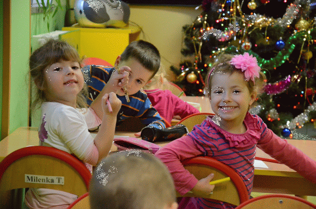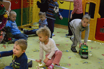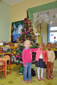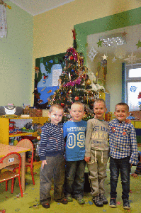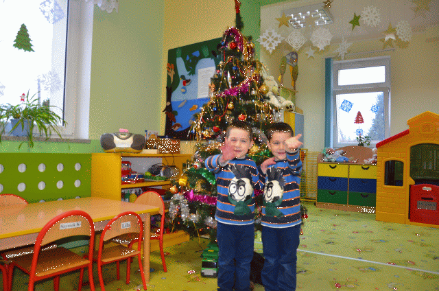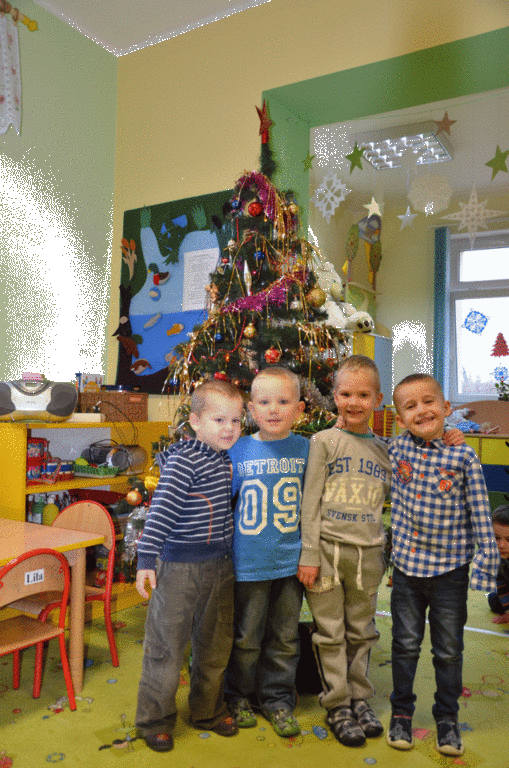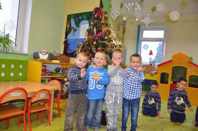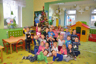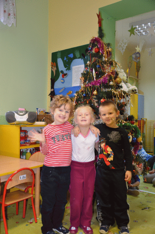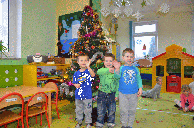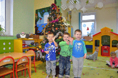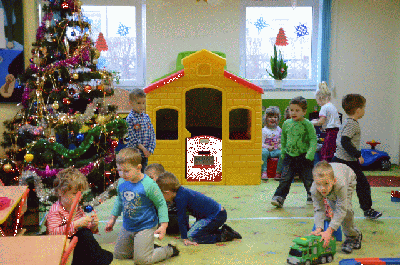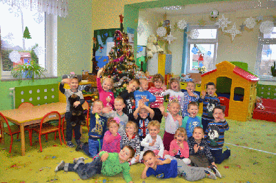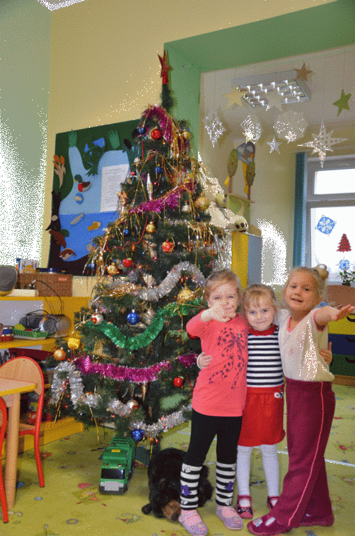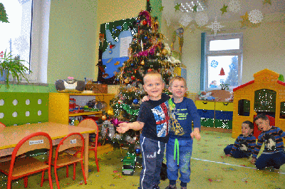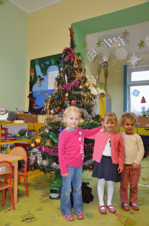 Nareszcie mogliśmy przystroić choinkę - nasze własne drzewko! Wygląda ślicznie, jak Kopciuszek przed balem:) Najładniejsze są złote jabłuszka, a może Mikołaj na nartach sunący po gałązkach świerku. Cała choinka skrzy i mieni się różnymi kolorami, gdy za oknem się ściemnia. I teraz zgadnijcie, gdzie najlepiej się bawić w sali? ... Oczywiście, pod choinką ;)
