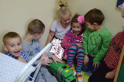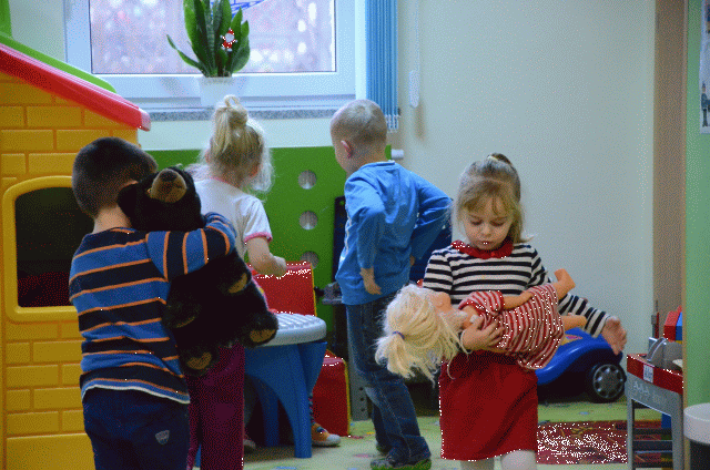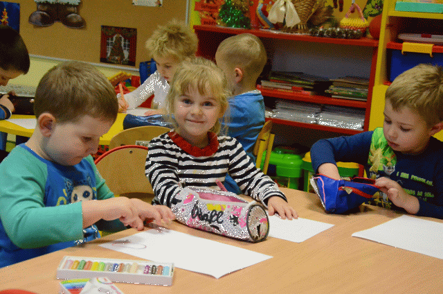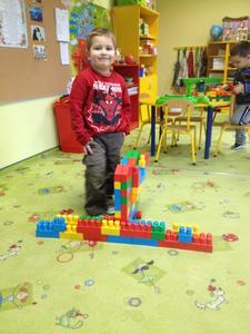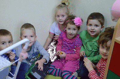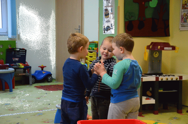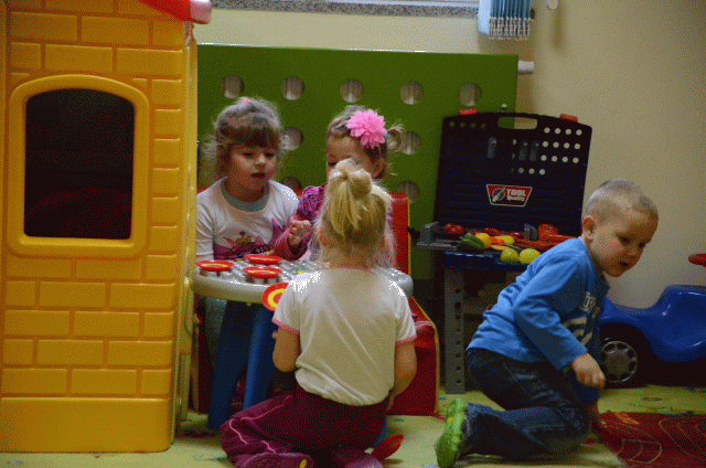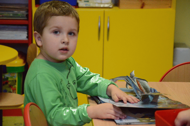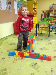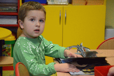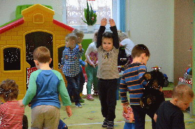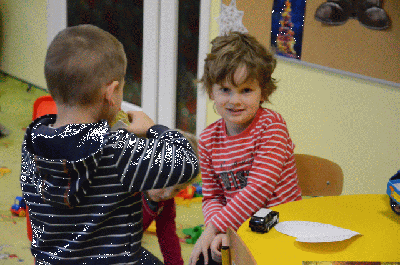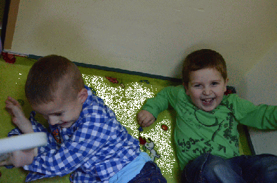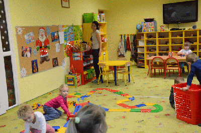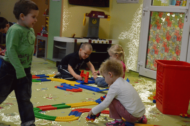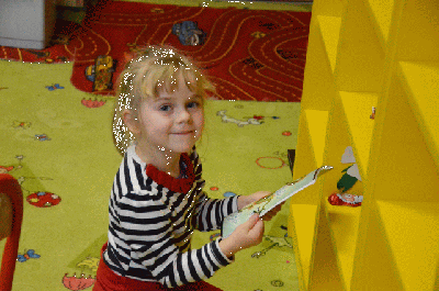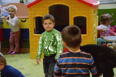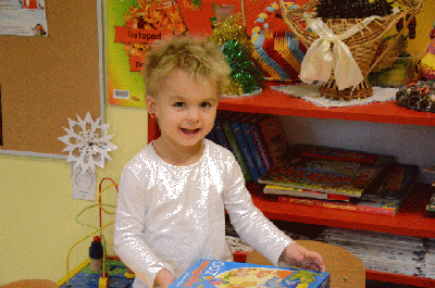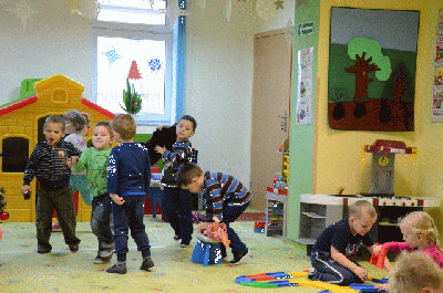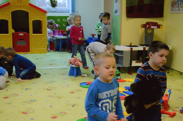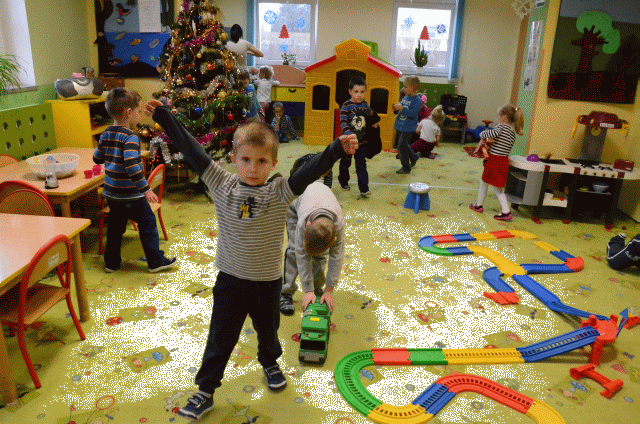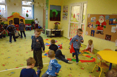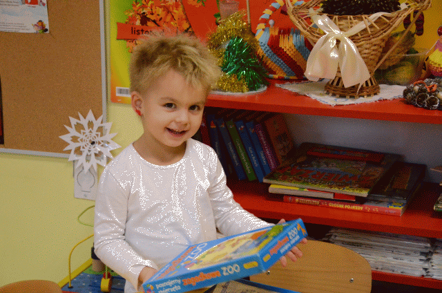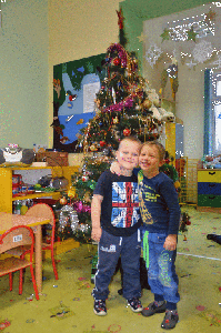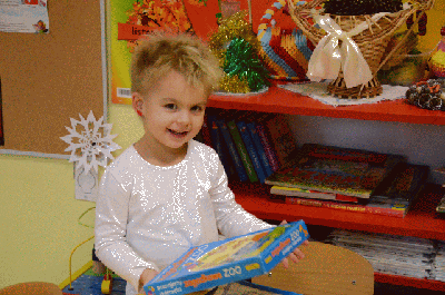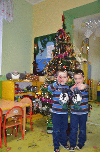 Nareszcie mogliśmy przystroić choinkę - nasze własne drzewko! Wygląda ślicznie, jak Kopciuszek przed balem:) Najładniejsze są złote jabłuszka, a może Mikołaj na nartach sunący po gałązkach świerku. Cała choinka skrzy i mieni się różnymi kolorami, gdy za oknem się ściemnia. I teraz zgadnijcie, gdzie najlepiej się bawić w sali? ... Oczywiście, pod choinką ;)