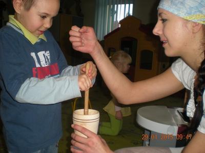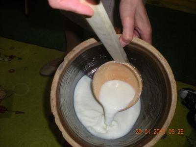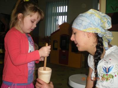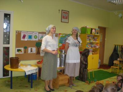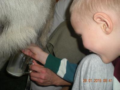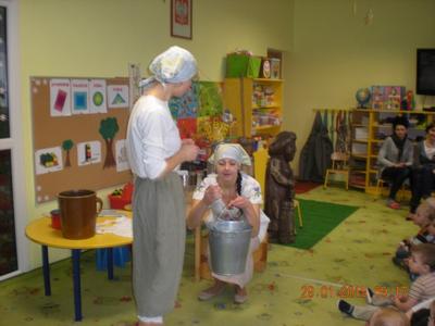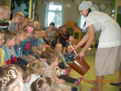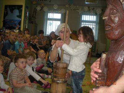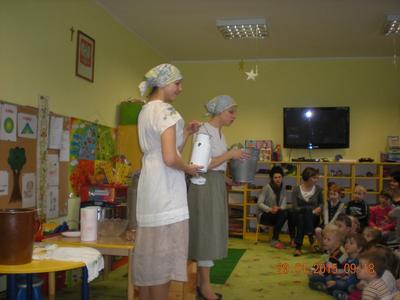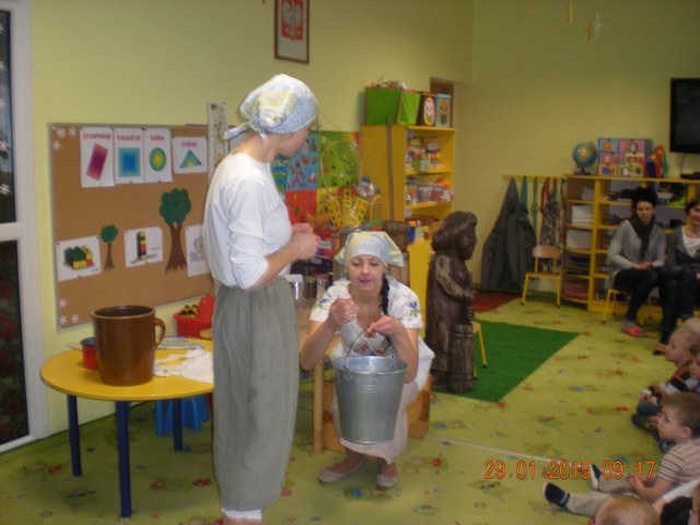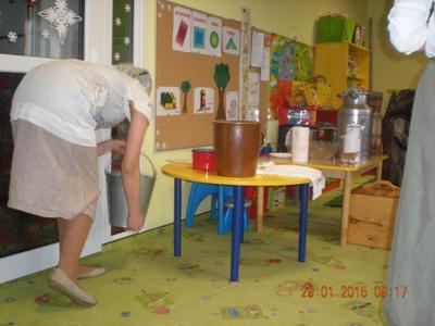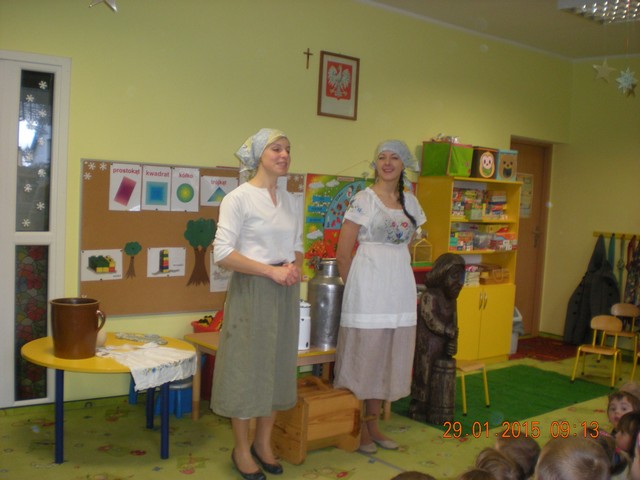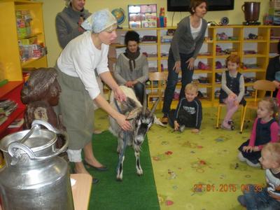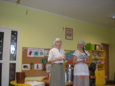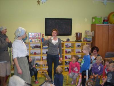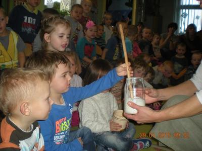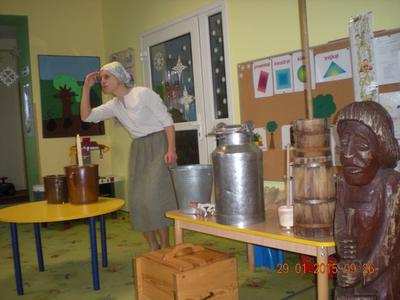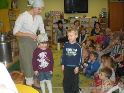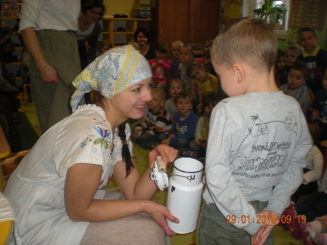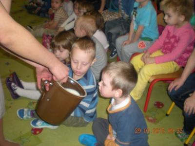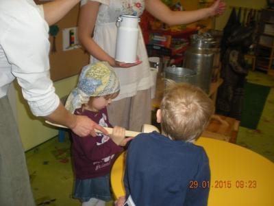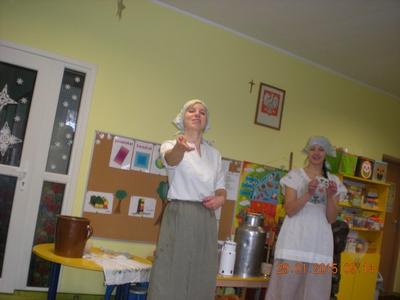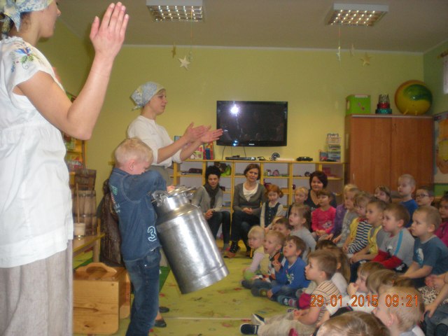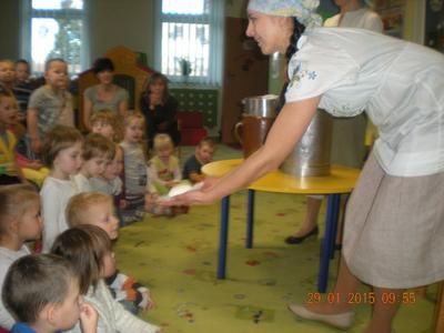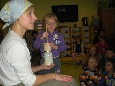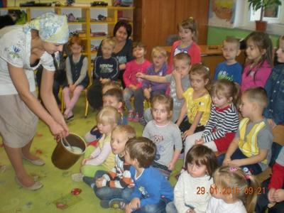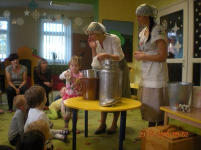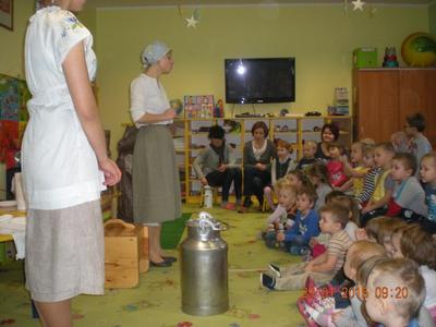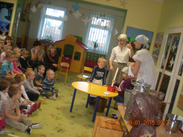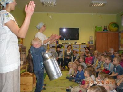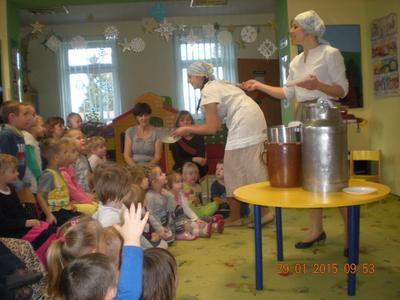 29 stycznia w naszym przedszkolu przedstawiony został Program edukacyjny dla dzieci pt. „Mleczna Droga w przedszkolu i szkole”. Podczas spotkania dzieci zapoznały się z procesem produkcyjnym masła i twarogu. Do tego celu były wykorzystane rekwizyty w postaci starodawnych urządzeń - centerfugi, masielnicy, cedzidła, warzęchy i kanki. Chętne osoby mogły sprawdzić swoje siły podczas wyrobu masła – odważnych osób nie brakowało. Dzieci również z wielkim zainteresowaniem przyglądały się w jaki sposób powstaje twaróg zanim trafi na nasze stoły.