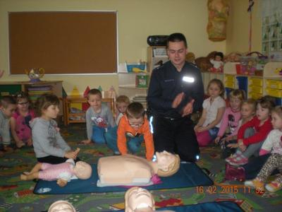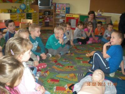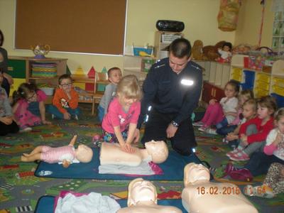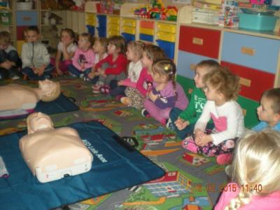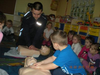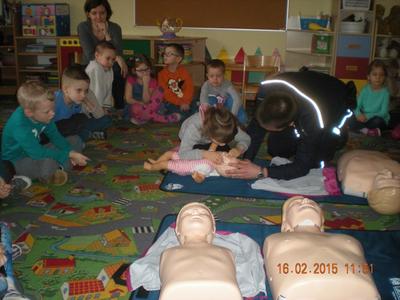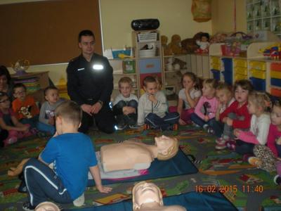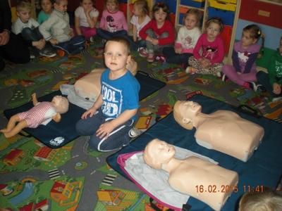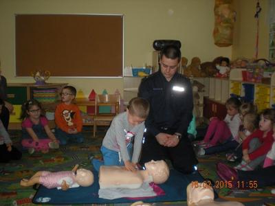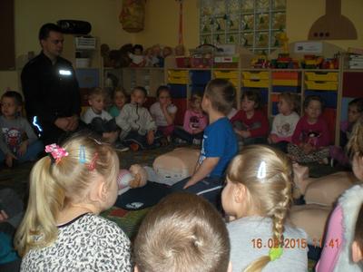 Dnia 16 lutego 2015 roku w naszym przedszkolu odbyło się spotkanie z zakresu udzielania pierwszej pomocy. Szkolenie prowadził ratownik medyczny - młodszy aspirant Wojciech Błaszkowski z Komendy Powiatowej Policji w Bytowie. Uczestnicy spotkania pracownicy i dzieci mogli dowiedzieć się, w jaki sposób należy pomagać osobom poszkodowanym, kogo należy wzywać w razie wypadku oraz co to jest reanimacja. Chętnych osób do udzielania pomocy było wiele Dziękujemy za pouczającą lekcję z zakresu bezpieczeństwa i udzielania pierwszej pomocy.