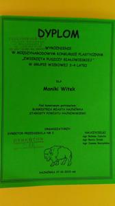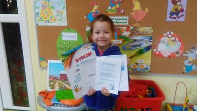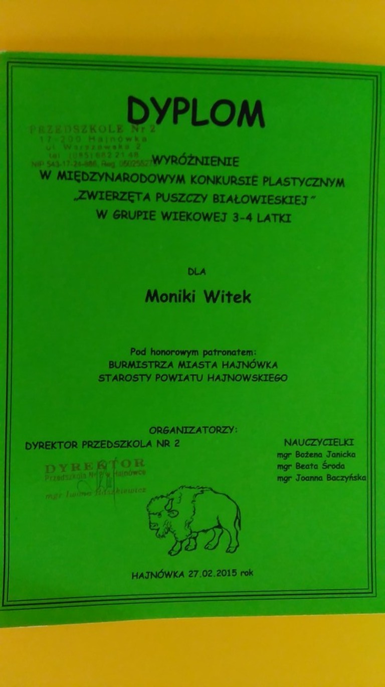 Gratulacje dla Moniki, której praca została wyróżniona podczas obrad jury Międzynarodowego Konkursu Plastycznego "Zwierzęta Puszczy Białowieskiej". Dziewczynka otrzymała dyplom oraz nagrody rzeczowe. Monika nie spodziewała się, że prima - aprilis będzie w tym roku tak szczęśliwy i radosny . Ponadto dzieci 4, 5 i 6 - cioletnie otrzymały dyplomy potwierdzające ich udział w wielu innych konkursach.