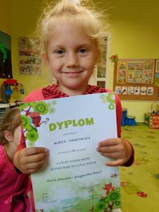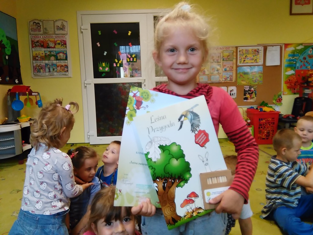 Dziś Pan Listonosz przyniósł do przedszkola pokaźną kopertę i od razu zaczęliśmy się domyślać, co w niej jest. Nadleśnictwo Gościeradów doceniło pracę plastyczną Marysi "Leśne zwierzęta przyjaciółmi dzieci". Dziewczynka otrzymała nie tylko dyplom pamiątkowy, ale również nagrodę rzeczową związaną z tematyką leśną. Brawo!