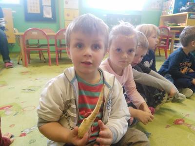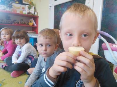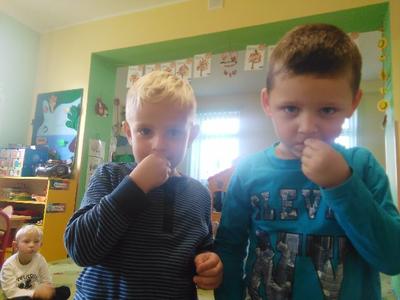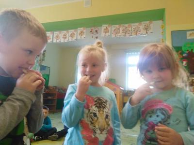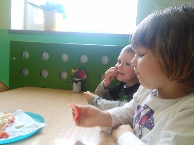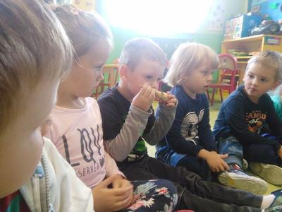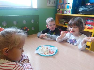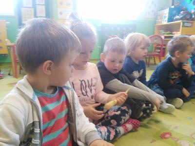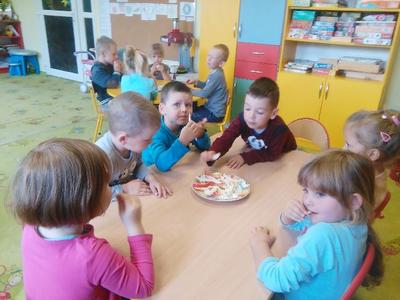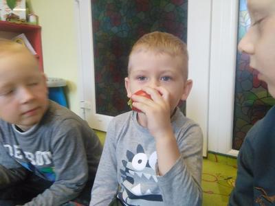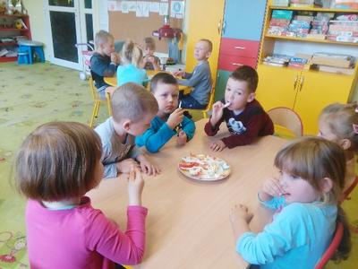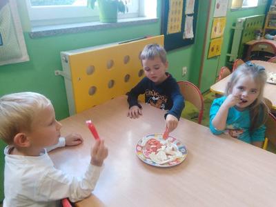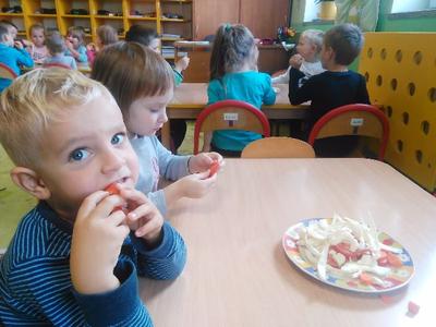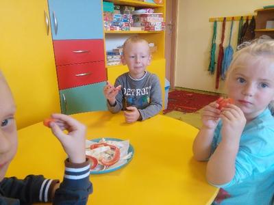 Dziś w sali Biedronek od rana pachniało bardzo apetycznie. Przedszkolaki poznawały za pomocą zmysłów smaku, węchu, wzroku i dotyku warzywa. Każdy miał okazję wypowiedzieć się na temat swojej ulubionej jarzynki. Dzieci mogły poznać i utrwalić zapachy polskich warzyw, ale największą radość sprawiła im degustacja. Najodważniejsi nie zrezygnowali ze skosztowania czosnku i cebuli, a niemal każdy zagryzał pachnący seler, kapustę, czerwone pomidorki i pietruszkę. Dzieci dowiedziały się również o istotnej roli warzyw dla naszej diety oraz o tym, jak wiele zawierają witamin. Przedszkolaki chętnie zakończyły zajęcia warzywnymi piosenkami i masażykami relaksacyjnymi.