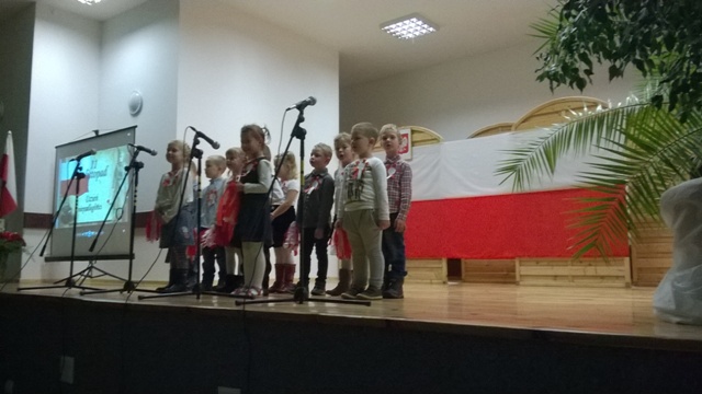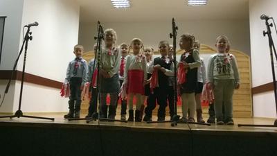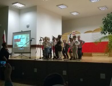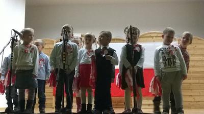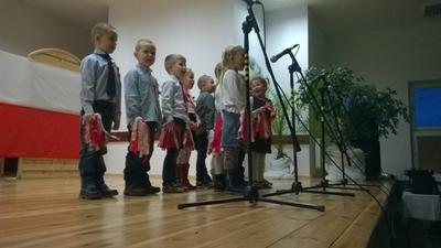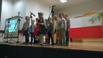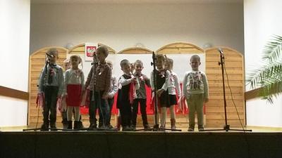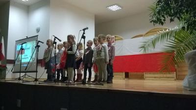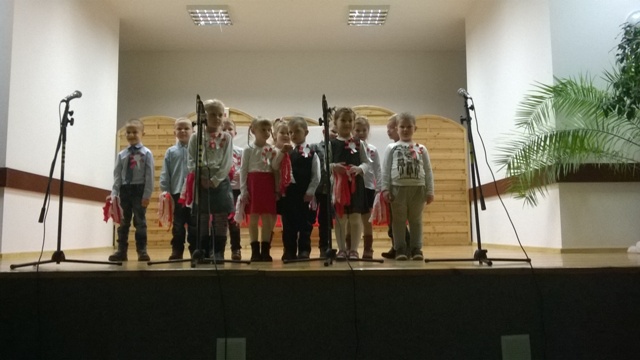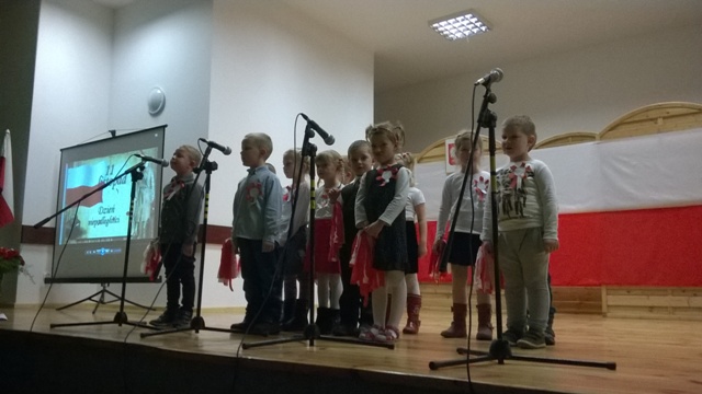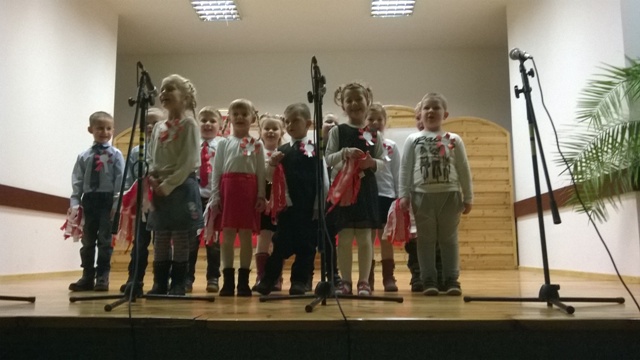 W tym roku po raz pierwszy przedszkolaki - nasi najmłodsi patrioci - zostały zaproszone do wystąpienia podczas uroczystej wieczornicy w Gminnym Ośrodku Kultury w Kołczygłowach. Dzieci długo przygotowywały się do tej uroczystości. Każde dziecko w przedszkolu zna nie tylko „Katechizm polskiego dziecka” Władysława Bełzy, ale również „Warszawiankę”, „Przybyli ułani pod okienko” oraz wiele innych polskich patriotycznych pieśni i wierszy. Przedszkolaki dumnie recytowały wiersze patriotyczne opowiadające o historii Polski, tłumaczące sens współczesnej polskości oraz namawiające do dostrzegania piękna ojczyzny. Chcąc zachęcić wszystkich gości do wspólnego śpiewu dzieci wręczyły tuż przed występem wykonane własnoręcznie śpiewniki z tekstami piosenek oraz biało – czerwone kotyliony. Dziękujemy wszystkim rodzicom za pomoc i współpracę.