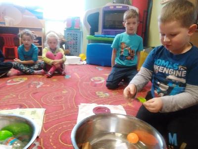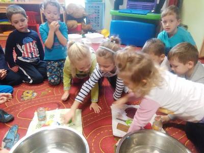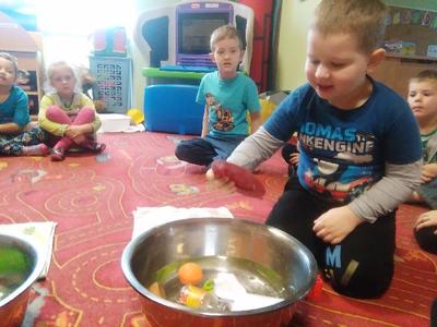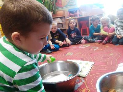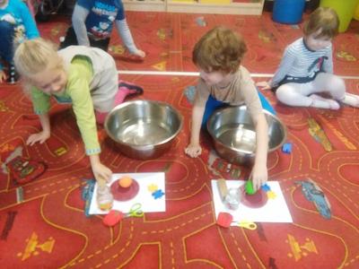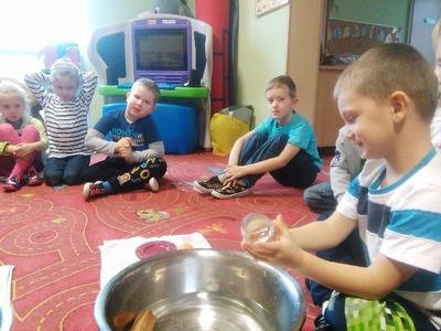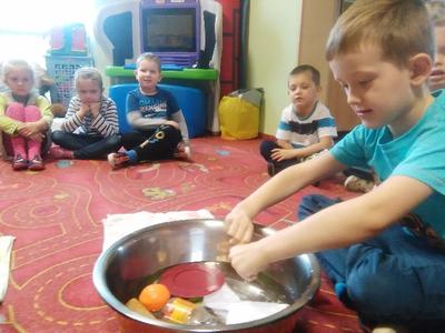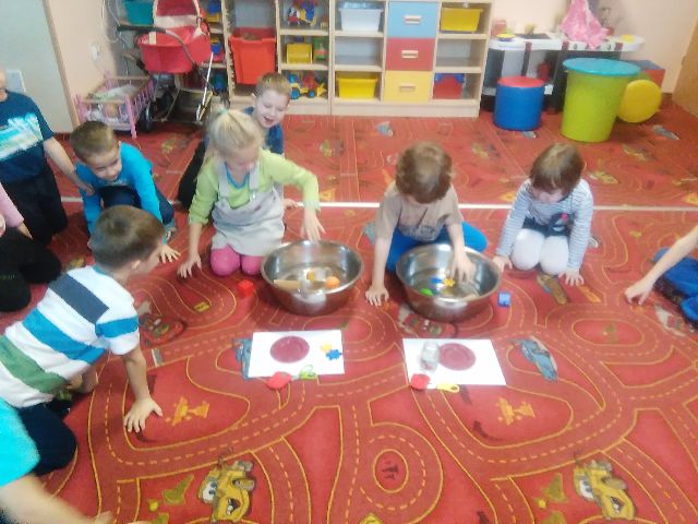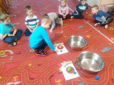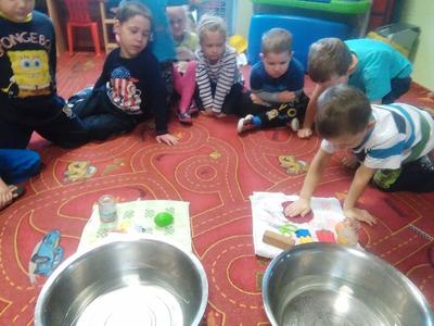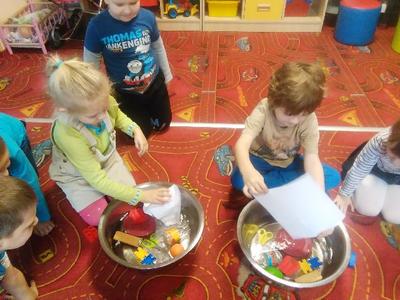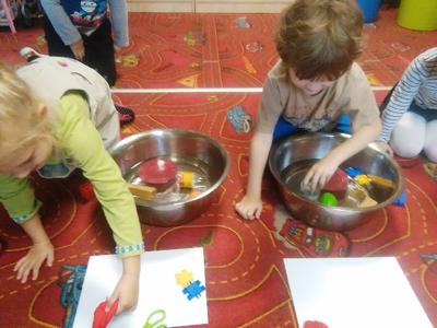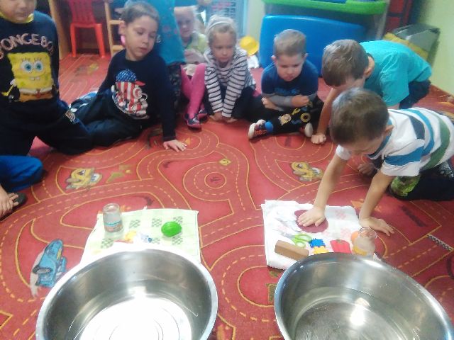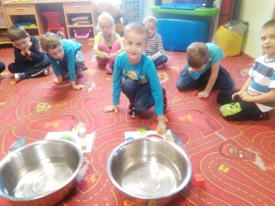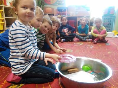 W ostatni piątek Misiaki odkrywały złe i dobre przewodniki ciepła za pomocą doświadczeń z gorącą i zimną wodą. Przedszkolaki bardzo poważnie i odpowiedzialnie podeszły do doświadczeń i przygotowały różne materiały (od tkanin po metale) do próby w ciepłej i zimnej wodzie. Wiedziały również, że należy zastosować wyjątkową ostrożność przy gorącej wodzie. Przy okazji dzieci przypomniały sobie podstawowe oznaczenia, zastosowane w każdym domu – czerwony kolor oznacza ciepłą wodę, niebieski kolor to zimna woda. Każdy chciał dokładnie sprawdzić, co stanie się z przedmiotami drewnianymi, metalowymi, szklanymi i z tworzywa sztucznego zanurzonymi w ciepłej i w zimnej wodzie. Dzieci kolejno zanurzały różne przedmioty z naszej sali w dwóch miskach, a następnie wyciągały wnioski. Wszyscy zgodnie stwierdzili, że zabawki i przedmioty ze szkła i metalu rozgrzewały się, a drewniane i z tworzywa sztucznego – nie. Ponadto dzieci wykazały się olbrzymią wiedzą na temat przedmiotów i rzeczy gorących i oddających ciepło oraz tych zimnych i schładzających. Podsumowaniem doświadczeń było udokumentowanie ich przez przedszkolaki na kartkach papieru.