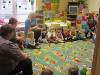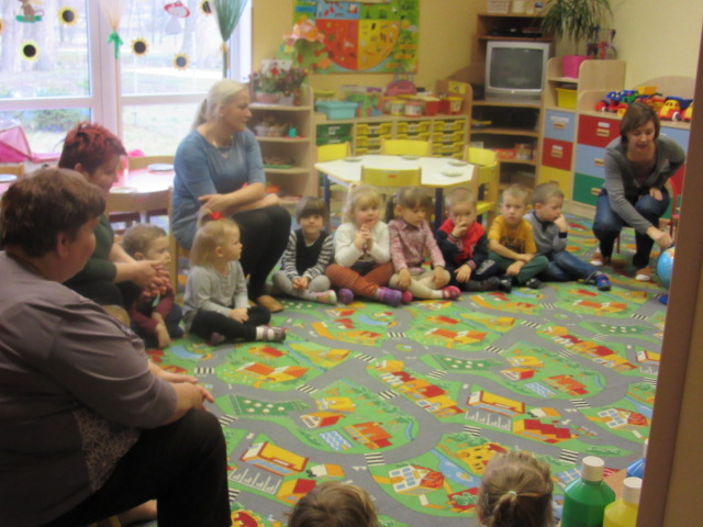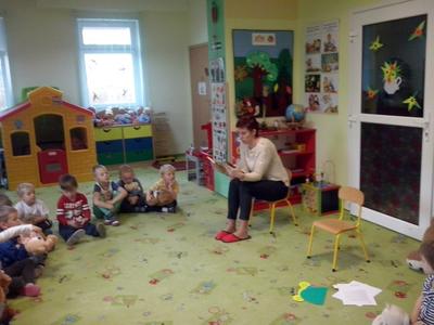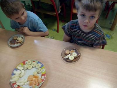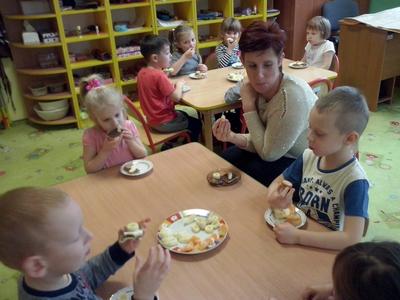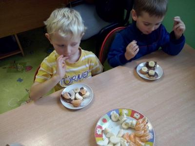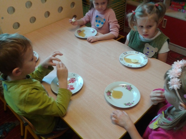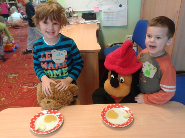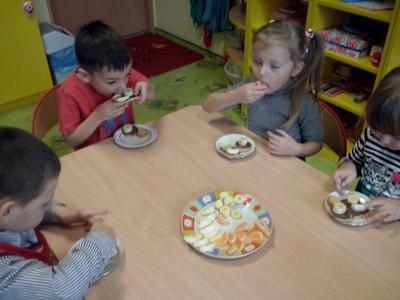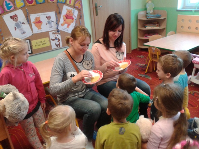 U Średniaków – Biedronek gościem w tym dniu była pani Aneta, mama Andrzejka, która przeczytała dzieciom opowiadanie Czesława Janczarskiego „Przyjaciele”. Przedszkolaki wykonały samodzielnie upominek dla swoich misiów – torcik, zaśpiewały pluszakom kołysankę „O kochaniu misia” i zatańczyły przy piosence „Jedzie pociąg”. W ramach promocji zdrowego żywienia dzieci i misie spałaszowały owocowy torcik. Niespodzianką były wspólne urodzinki misiów i Kubusia, który dziś skończył 4 lata.