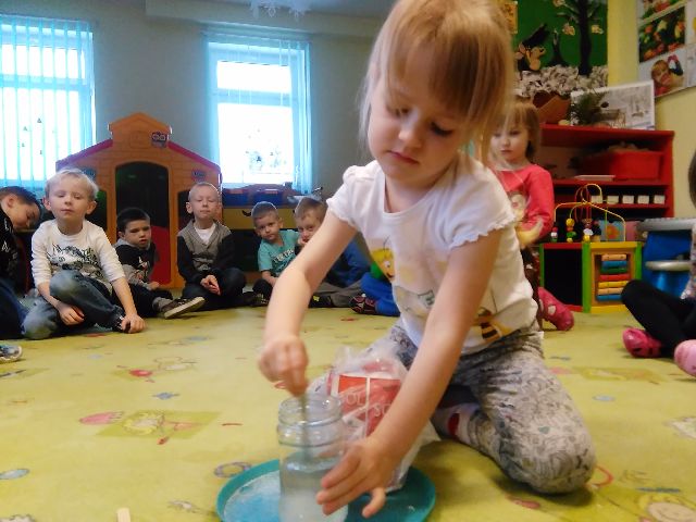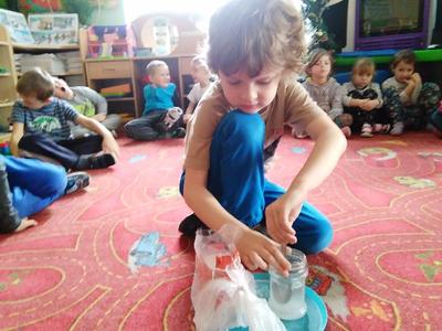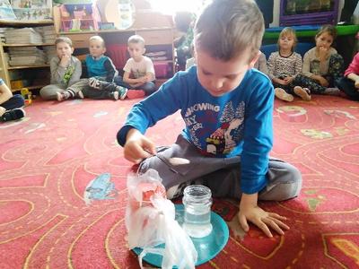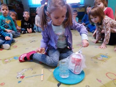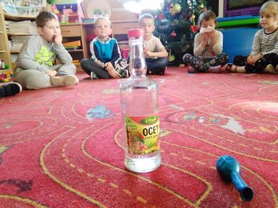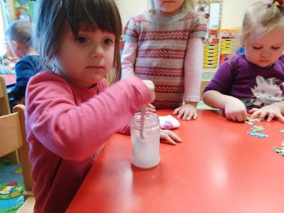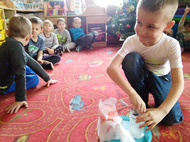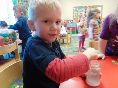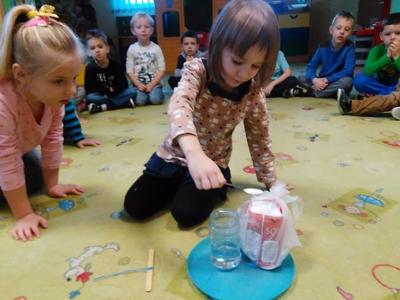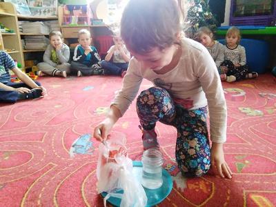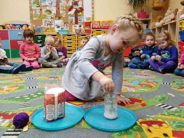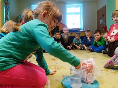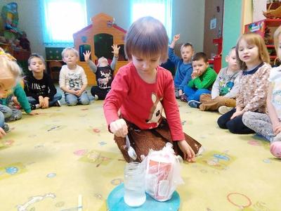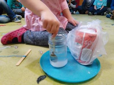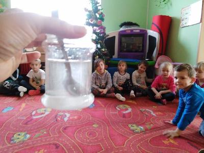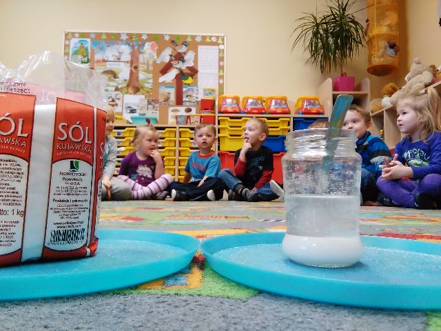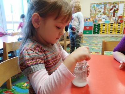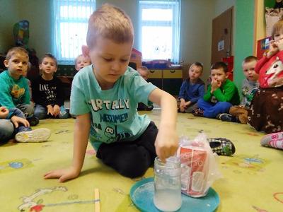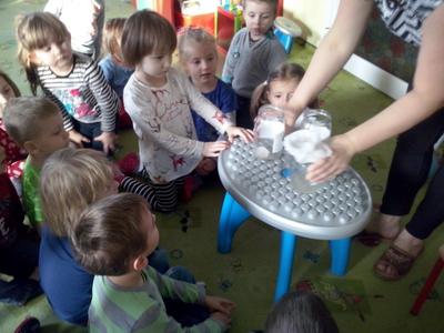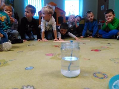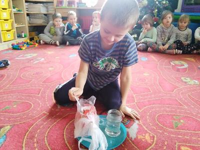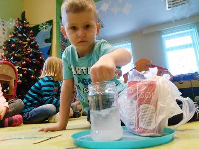 W ostatnich dniach dzieci miały okazję poznać i wykonać kilka prostych doświadczeń związanych z zimą. Średniaki obserwowały i poznawały różne tropy na śniegu i badały, czy bialutki śnieg jest czysty. Maluszki wykonały roztwór soli, na którym - mamy nadzieję - niedługo pojawią się kryształki soli przypominające kunsztownie zbudowane płatki śniegu. Starszaki natomiast dowiedziały się, że ocet w połączeniu z sodą może nadmuchać balon.
