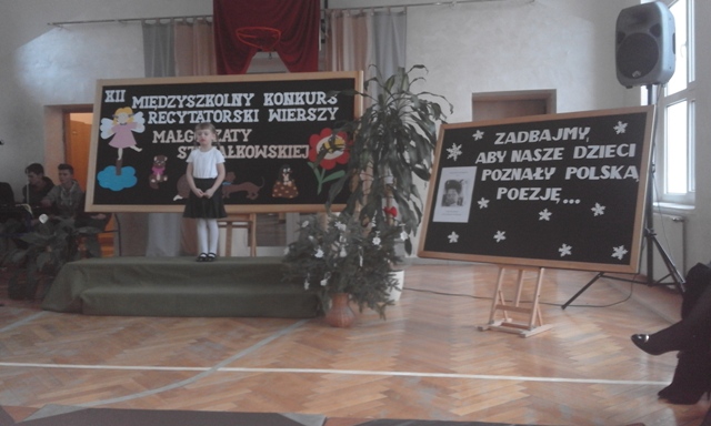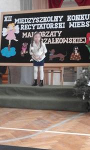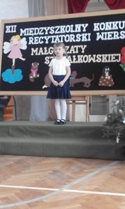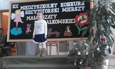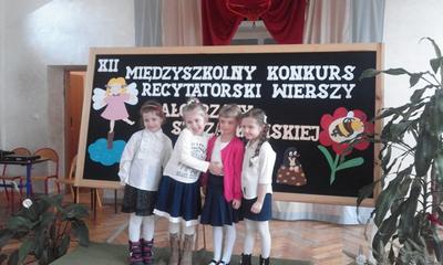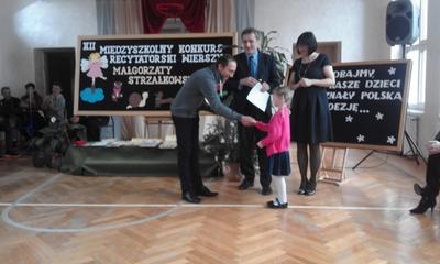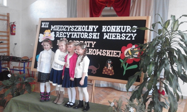 Dnia 05 lutego dzieci z najstarszej grupy przedszkolnej ,,Misiaki” wzięły udział w XII Międzyszkolnym Konkursie Recytatorskim wierszy Małgorzaty Strzałkowskiej, który odbył się w Zespole Szkół w Kołczygłowach. Celem konkursu było m.in.: popularyzacja wierszy znakomitych poetów oraz rozwijanie umiejętności recytatorskich. Do zmagań konkursowych wśród wielu uczniów przystąpiło 4 naszych przedszkolaków: Ewelina N., Monika W., Maja L. i Lilianna T. Jury oceniło wykonawców w dwóch kategoriach wiekowych. I tak: w I kategorii wiekowej - dzieci przedszkolne i dzieci z klas ,,zerowych” Ewelinka N. zdobyła - I miejsce, a Lilka T. - III. Pozostałe dwie nasze uczestniczki: Monika W. i Maja L. zdobyły wyróżnienia. Dzieci nagrodzono książkami, dyplomami oraz innymi upominkami. Serdecznie im gratulujemy! Kolejny konkurs już za rok.