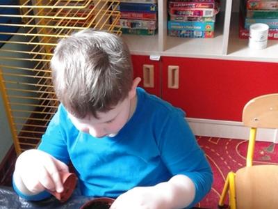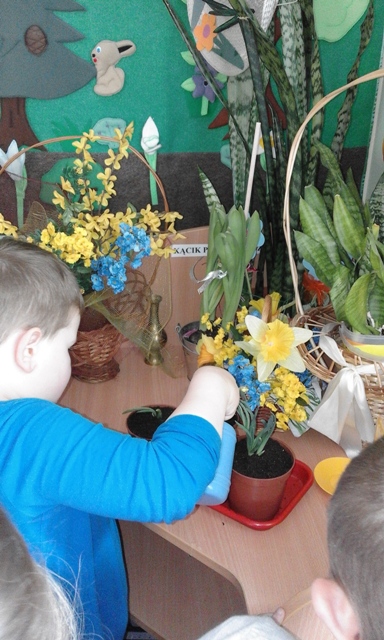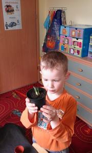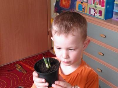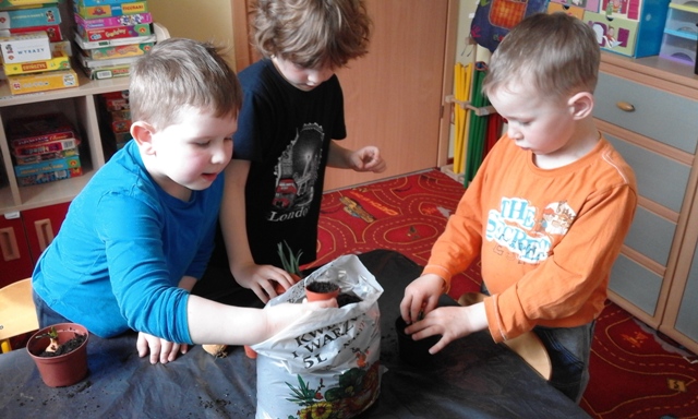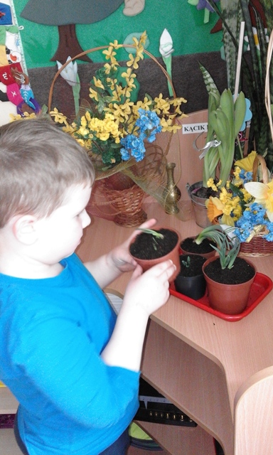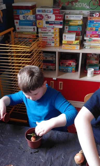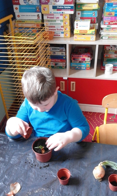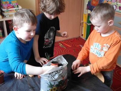 Starszaki ,,Misiaki” bardzo lubią bułeczki i kanapki ze szczypiorkiem. Dlatego postanowiły same go wyhodować w przedszkolnym kąciku przyrody ( z własnej hodowli jest przecież najlepszy). Maks, Olek i Mateusz znają się dobrze na wiosennych pracach w ogródku, dlatego bez wahania przystąpili do pracy. Cebula posadzona, lada dzień będzie szczypiorek, nie możemy się już doczekać.