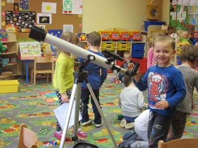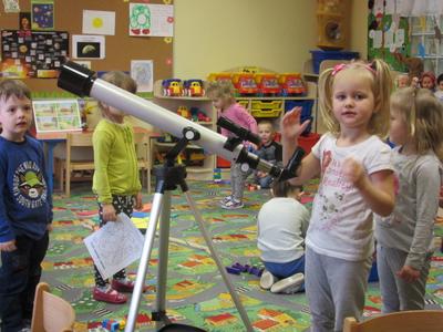 Co by było, gdyby słońce i księżyc świeciły w dzień? Co to jest księżyc? Czy istnieje życie na księżycu? Na te pytania i wiele innych próbowały znaleźć odpowiedź dzieci z grupy najmłodszej KRASNALE. Maluszki poszerzyły swoją wiedzę na temat przestrzeni kosmicznej. W czasie zabawy WYPRAWA W KOSMOS poznały pracę kosmonauty, zapoznały się również z zasadmi działania teleskopu. Na zakończenie rozważań na temat kosmosu maluszki konstruowały wspaniałe statki kosmiczne.