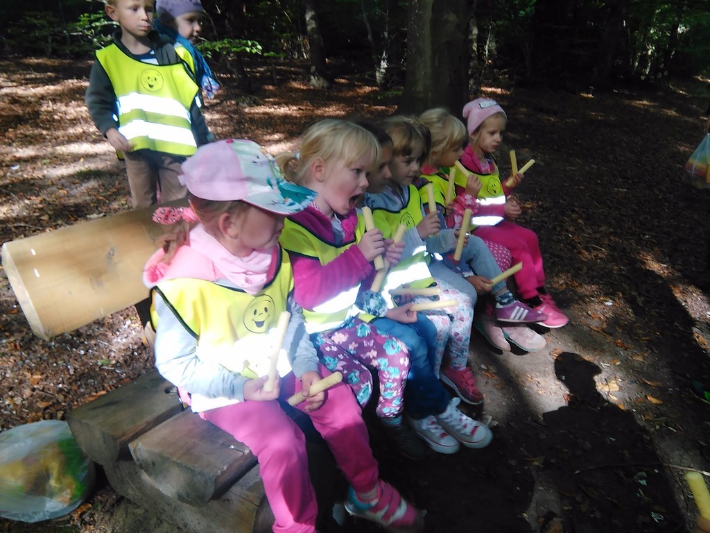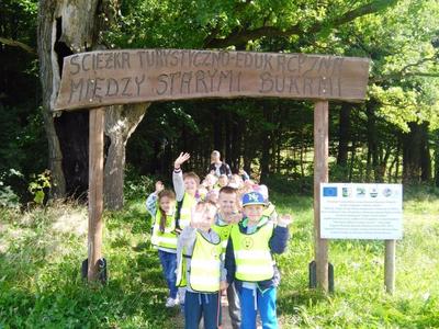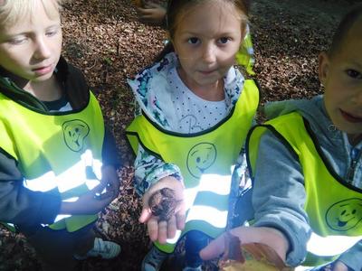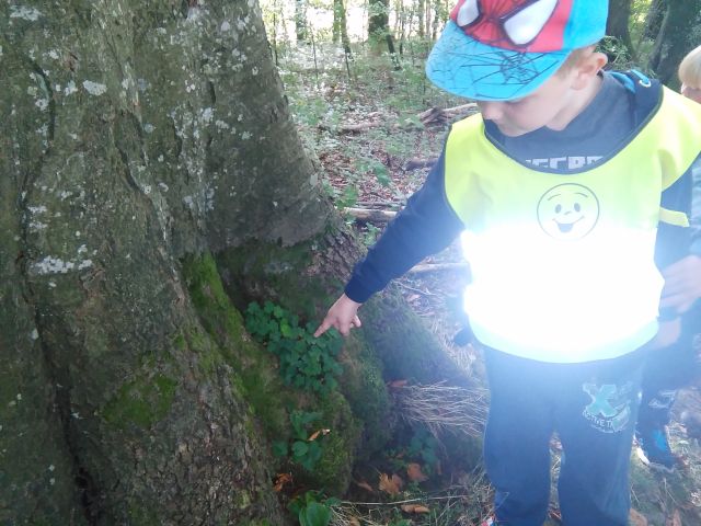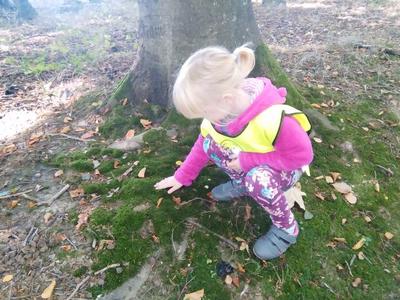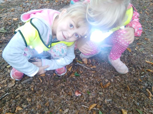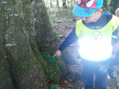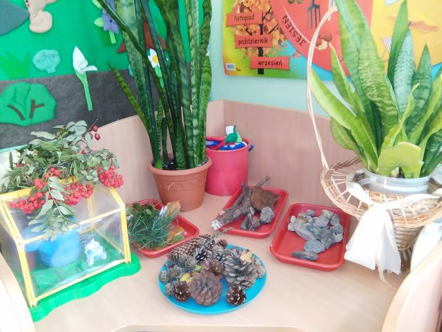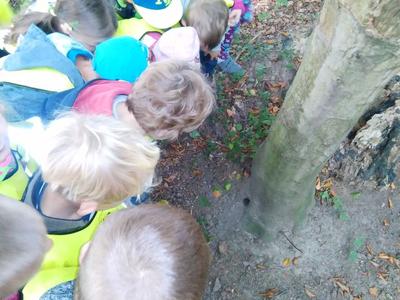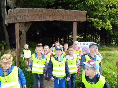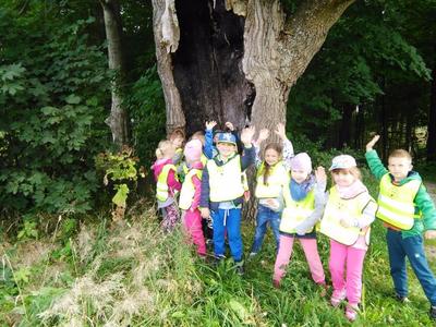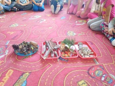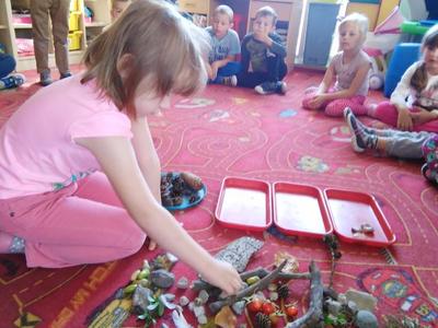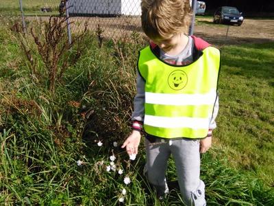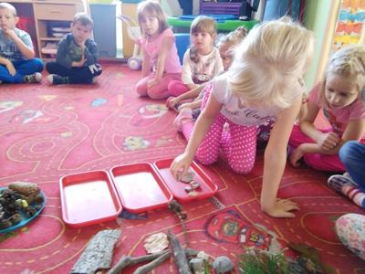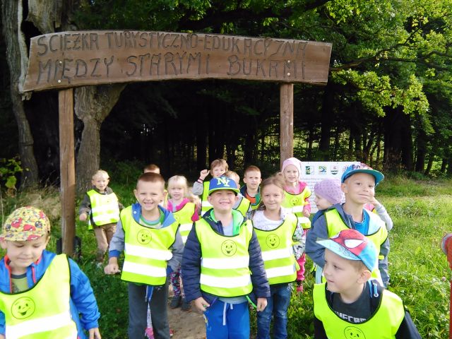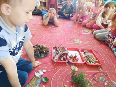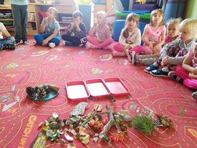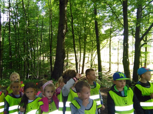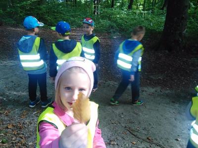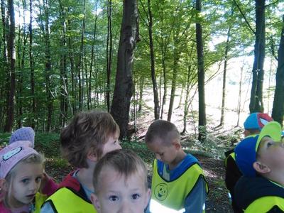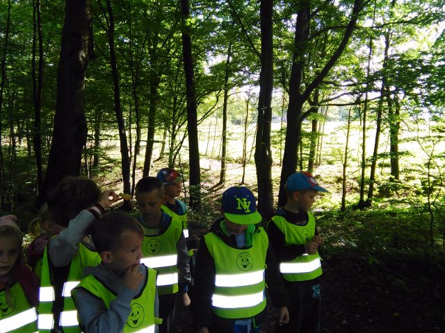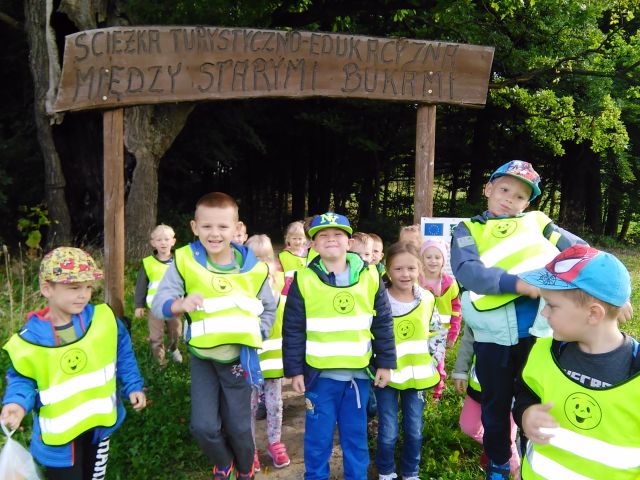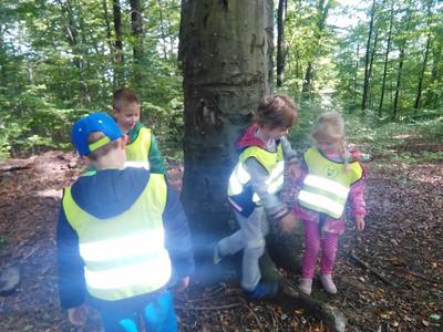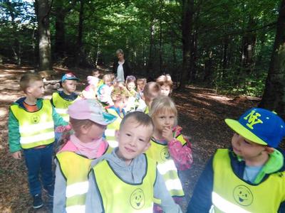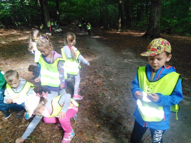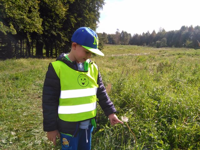Korzystając ze słonecznej pogody wybraliśmy się na spacer do pobliskiego Parku Krajobrazowego „Dolina Słupi”. Tam wspólnie podziwialiśmy piękną przyrodę i gromadziliśmy dary jesieni, które później trafiły do naszego kącika przyrody. Ponadto starszaki wykazały się doskonałą znajomością zasad bezpiecznego poruszania się chodnikiem i wiedzą, jak należy zachowywać się podczas bezpośrednich kontaktów ze środowiskiem leśnym.