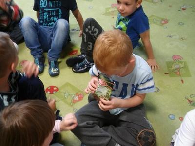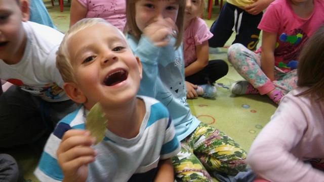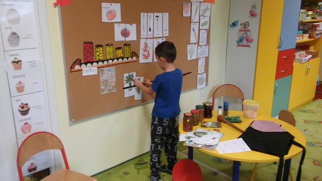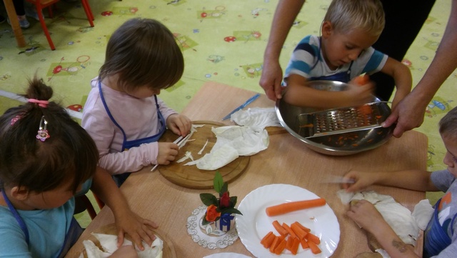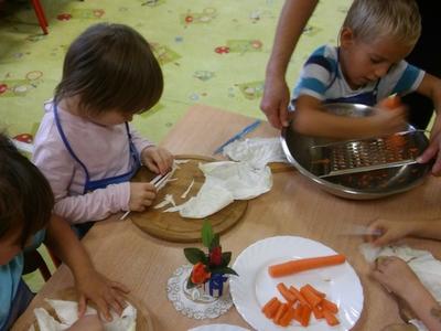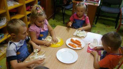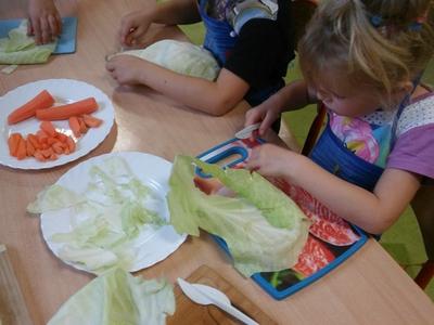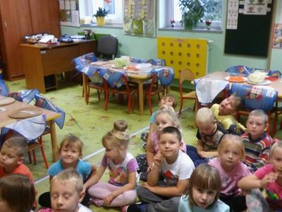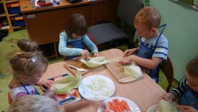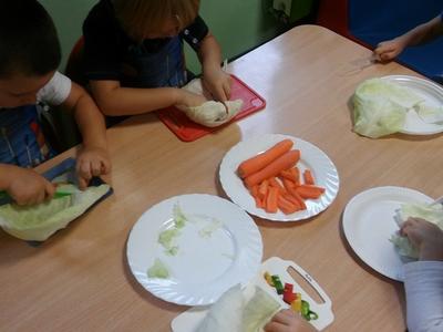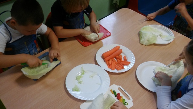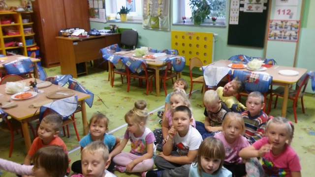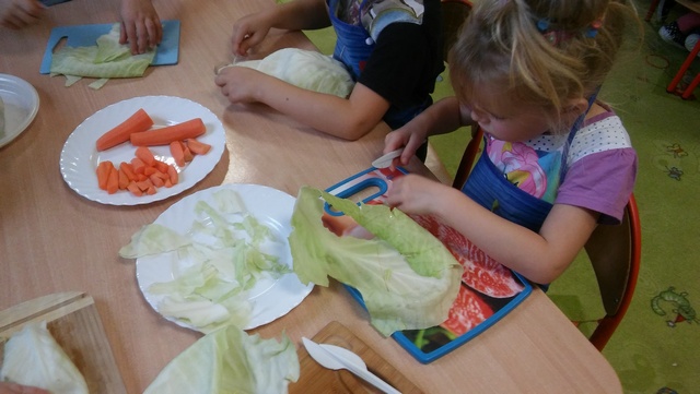 Dzisiaj dzieci z naszej grupy mogły się wykazać zdobytą wiedzą na temat warzyw. W czasie zajęć smakowały kapustę świeżą, kiszoną oraz marchewkę. Wypowiadały się na temat ich walorów kolorystycznych, smakowych i zapachowych. Poznały sposób kiszenia kapusty. Pod opieką pań tarły marchewkę, kroiły kapustę, ubijały, przyprawiały oraz wkładały kapustę do słoików. Po czym umieściły słoiki z kapustą w kąciku przyrody, gdzie będą mogły obserwować proces fermentacji.Za około dwa tygodnie sprawdzimy, jak smakuje nasza kiszona kapusta.