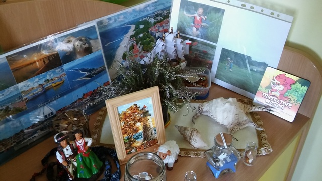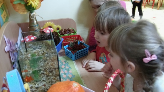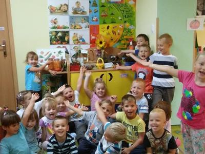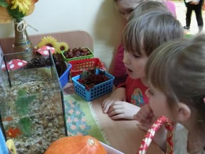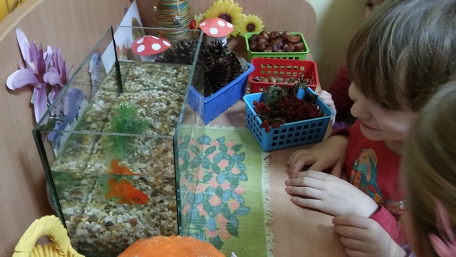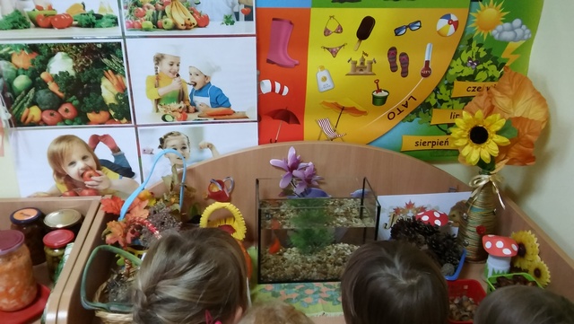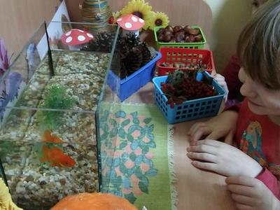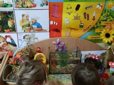Kącik przyrodniczy w naszej grupie znowu się troszeczkę zmienił. Na początku znajdowały się w nim skarby i pamiątki zdobyte w czasie wakacji, później pojawiły się jesienne dary przyrody: żołędzie, kasztany, szyszki, jesienne bukiety, owoce, warzywa oraz własnoręcznie kiszona kapusta. Obecnie kącik wzbogacił się o akwarium z rybką – welonką. Dzieci chętnie i z zaciekawieniem obserwują zachowanie rybki i deklarują swoją pomoc do sprawowania opieki nad akwarium.