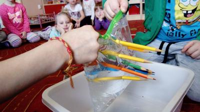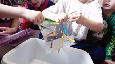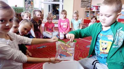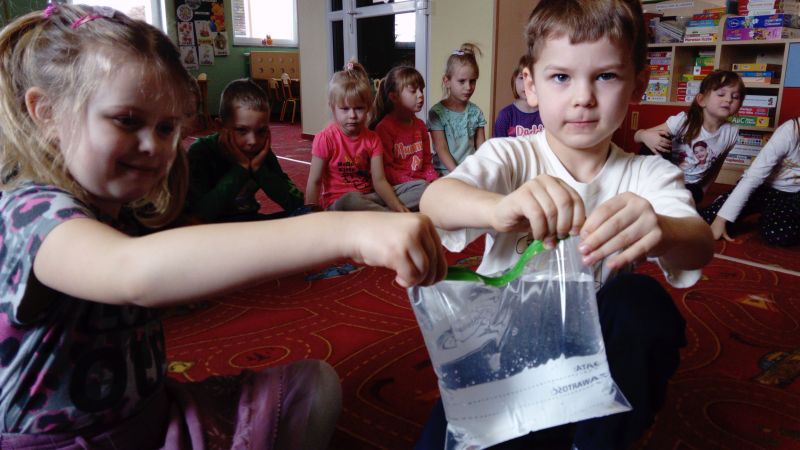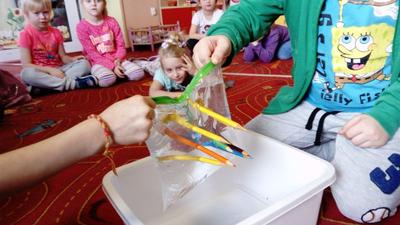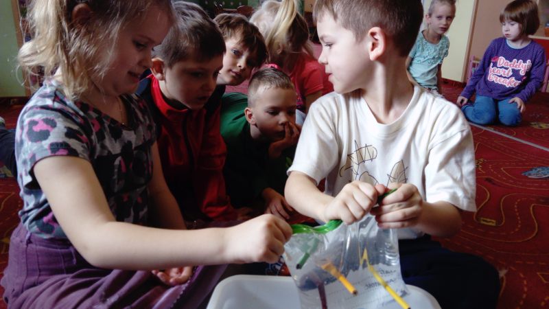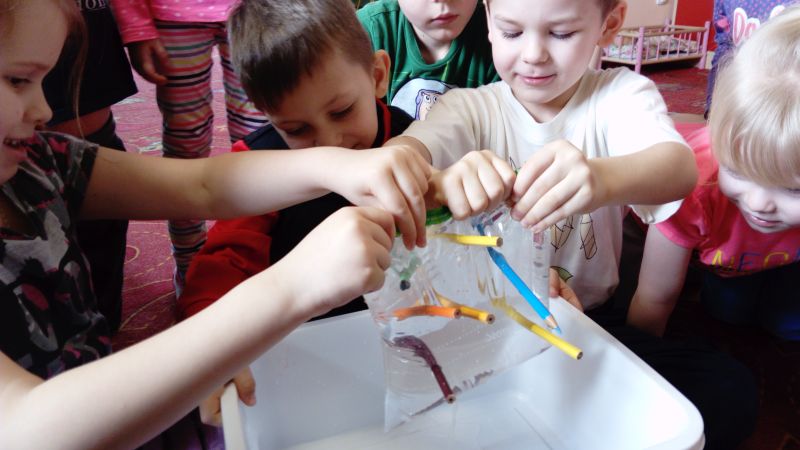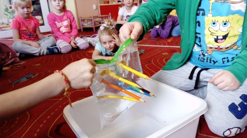 Kto by kiedykolwiek pomyślał, że worek, trochę wody i kilka ołówków mogą stworzyć świetny magiczny pokaz? Wykonaliśmy ostatnio doświadczenie o nazwie „Torebka Fakira”, które wykazało że mimo przebicia woreczka ostrymi kredkami woda nie wyciekła, gdyż plastik szczelnie ułożył się wokół kredek. Mali naukowcy czekają na nowe doświadczenia i pomysły!