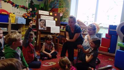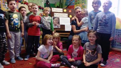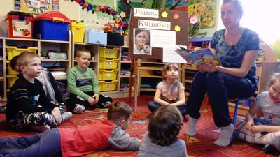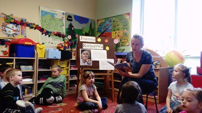 Marzec to kolejny miesiąc spotkań z literaturą dla dzieci prezentowaną w ramach akcji Cała Polska czyta dzieciom”. Tym razem do naszego Klubu Czytających Rodzin wstąpiły: mama Stasia P. w grupie ,,Krasnali” i mama Ewelinki N. w grupie ,,Misiaków”. Obie Panie zapoznały dzieci z twórczością polskiej poetki, prozaik, autorki utworów scenicznych oraz książek dla dzieci i młodzieży Joanny Kulmowej. Poetka wydała tomiki wierszy dla dzieci, m.in. Śpiew lasu , Wiersze dla Kai, Zasypianki, Krześlaki z rozwianą grzywą, Niebo nad miastem, Zagubione światełko. Kierowana do dzieci poezja poetki odznacza się połączeniem humoru i głębokiego liryzmu. Niedawno, bo 25.marca Ta znakomita pisarka obchodziła swoje 89 urodziny. Czytającym mamom bardzo dziękujemy a jubilatce życzymy wszystkiego najlepszego.