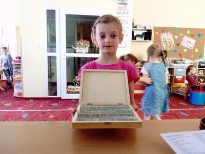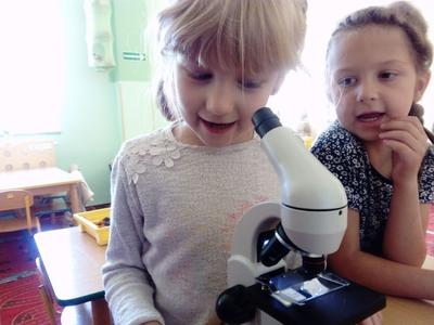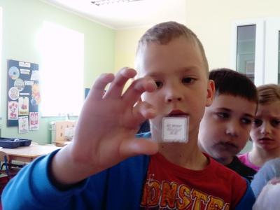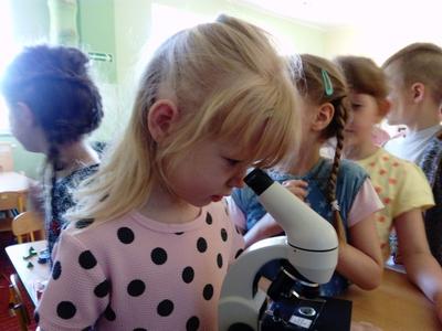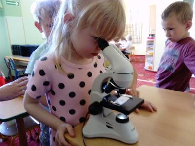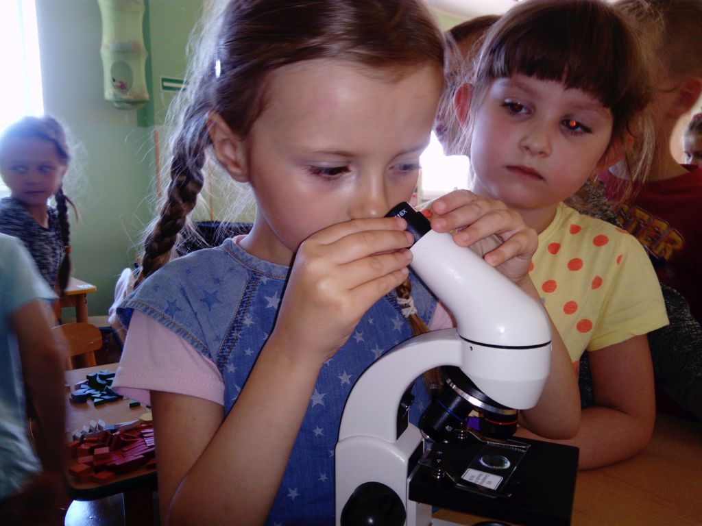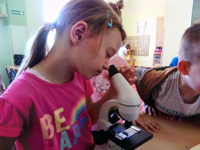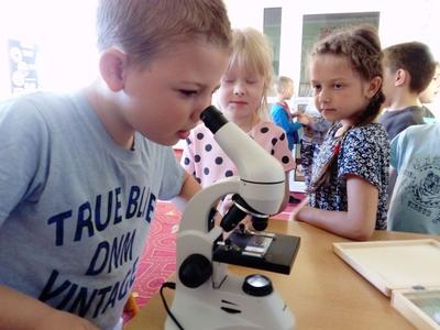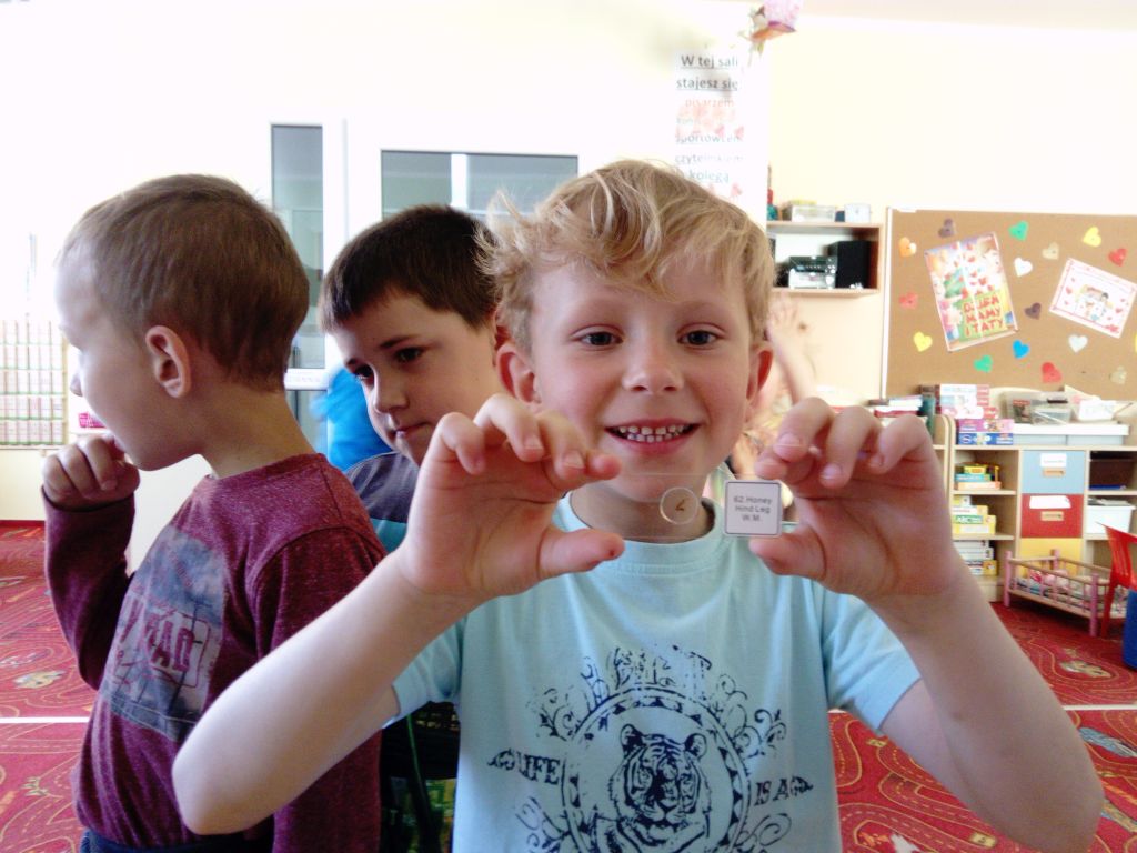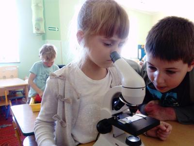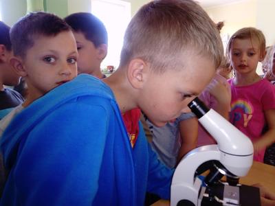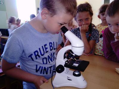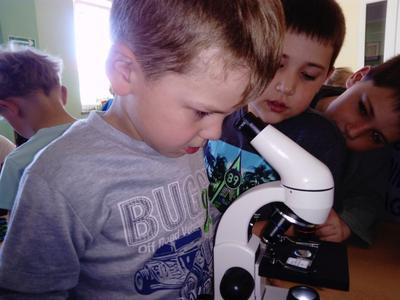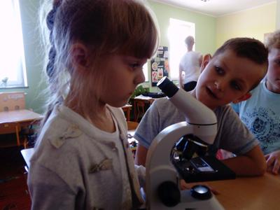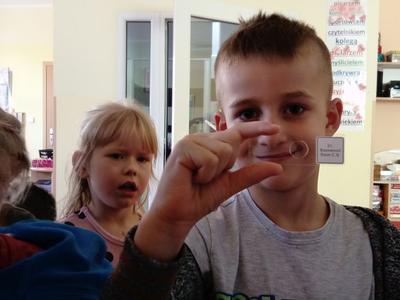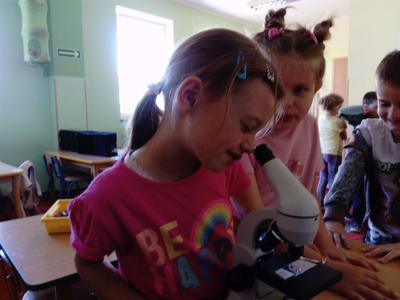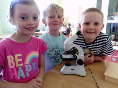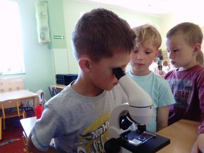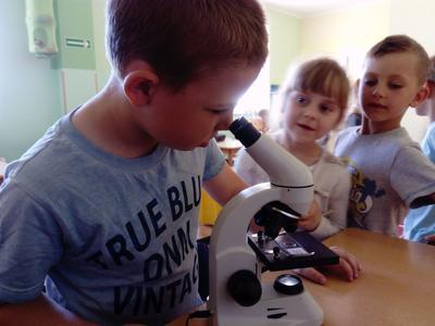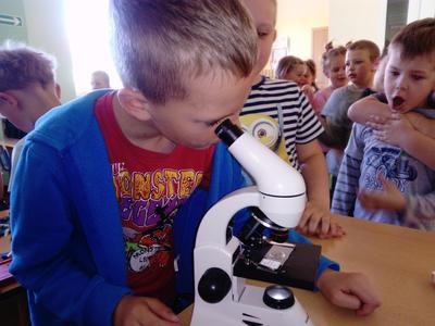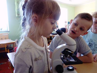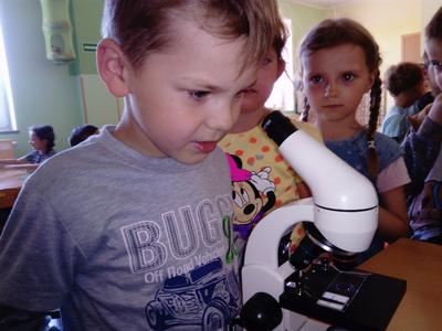 Starszaki poznały dziś budowę mikroskopu oraz obserwowały pod dużym powiększeniem kilka preparatów. Najbardziej spodobały się aparaty gębowe motyla i pszczoły miodnej, powiększona noga pająka oraz przekrój nasiona lipy. Dzieci obejrzały też kilka pasożytów oraz tkanki płuca, rdzenia kręgowego, paproci i cebuli.