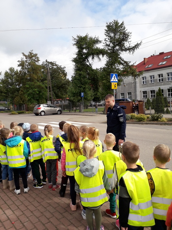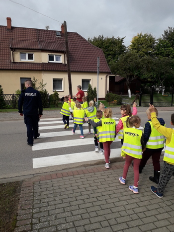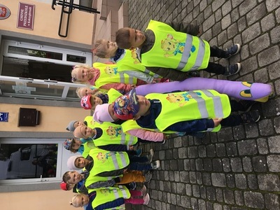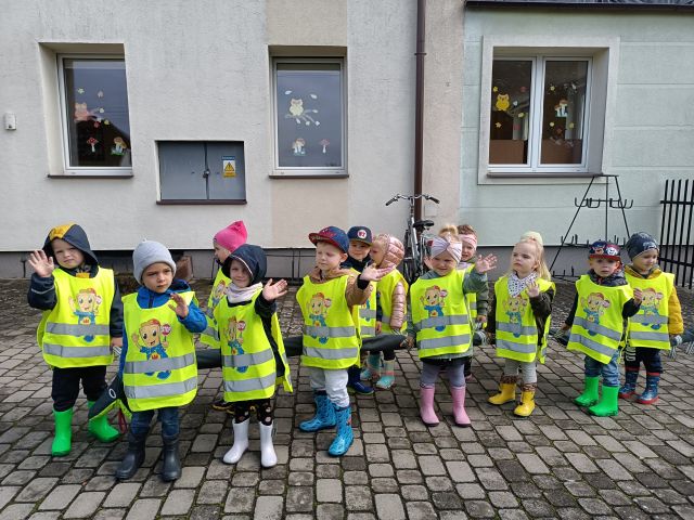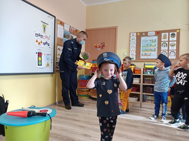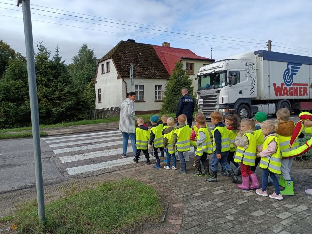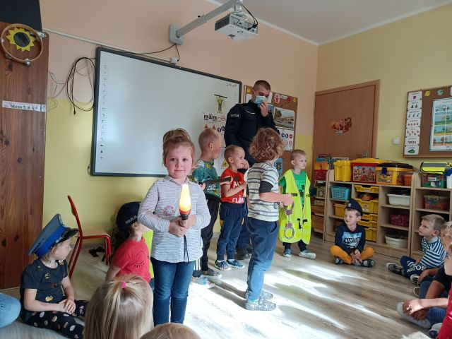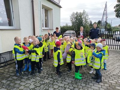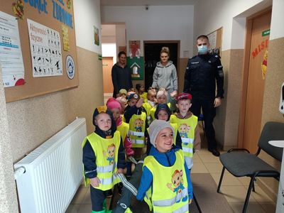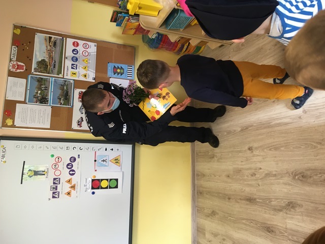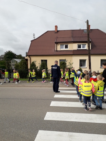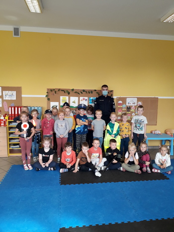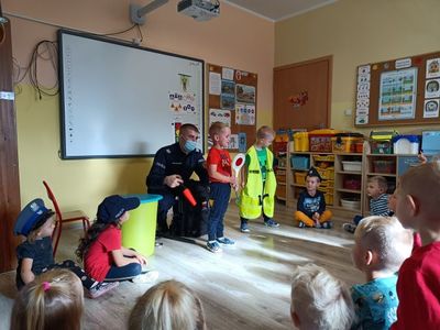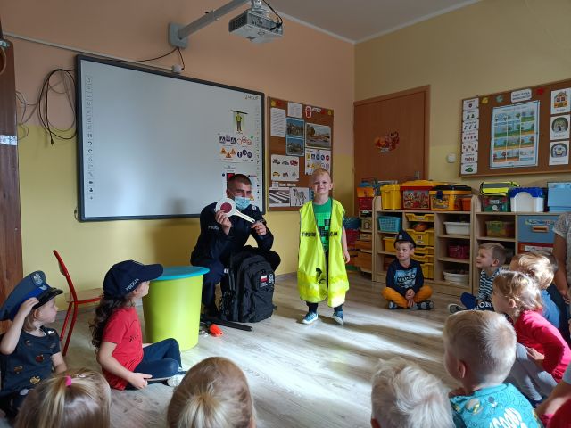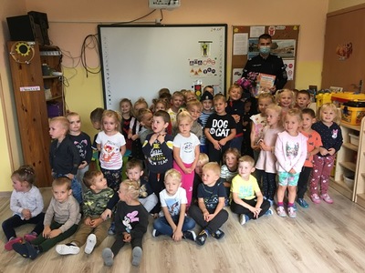 14 września 2021 r. w naszym przedszkolu odbyło się spotkanie z policjantem Panem Damianem G. z Komendy Powiatowej Policji w Bytowie. Podczas spotkania funkcjonariusz przybliżył przedszkolakom zagadnienia związane z bezpieczeństwem, ruchem drogowym. Dzieci utrwaliły zasady bezpiecznego poruszania się po drodze, przypomniały podstawowe znaki drogowe, w szczególności oznakowanie przejścia dla pieszych. Policjant przypomniał także numery alarmowe i sytuacje w jakich należy z nich korzystać. Na koniec spotkania przedszkolaki miały okazję poćwiczyć prawidłowe przejście po pasach, a następnie wręczyły przygotowane upominki.