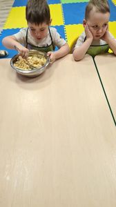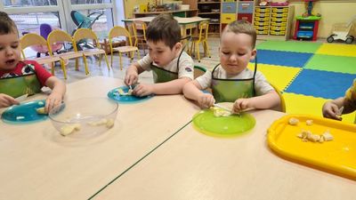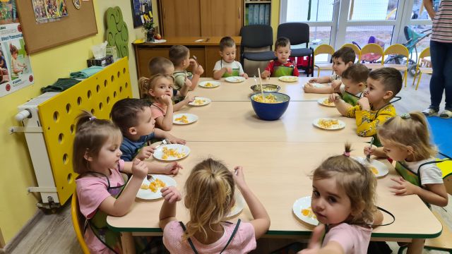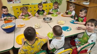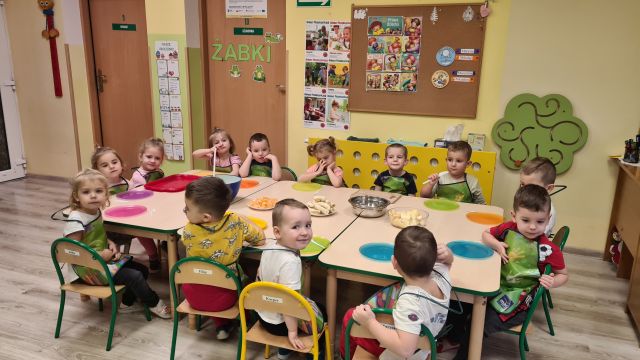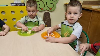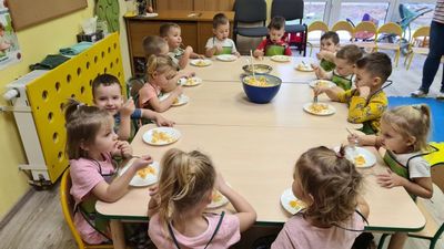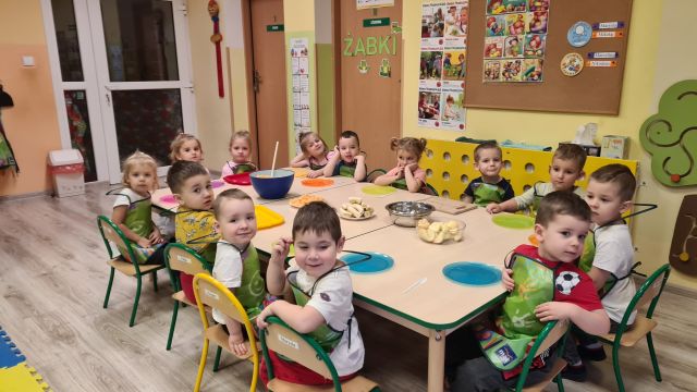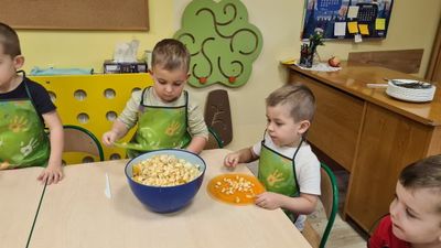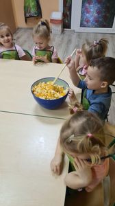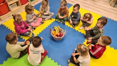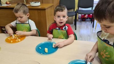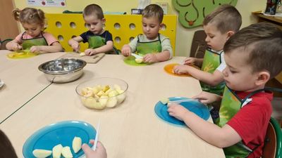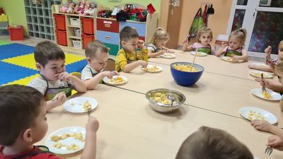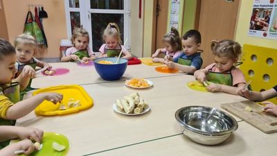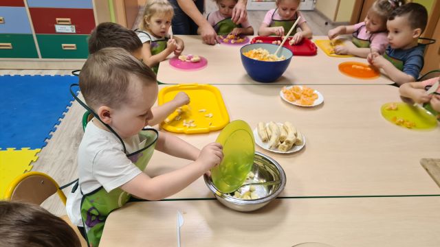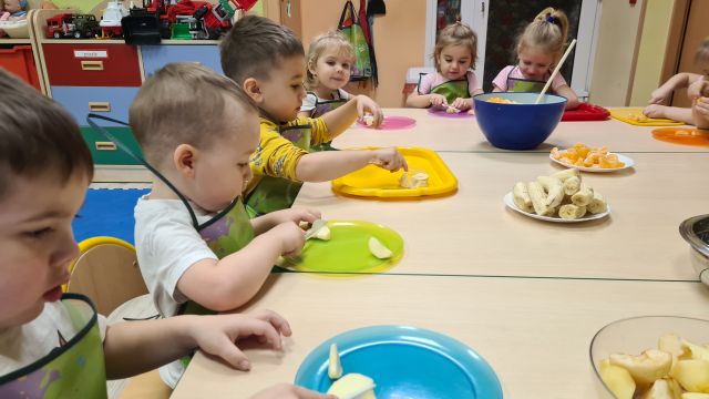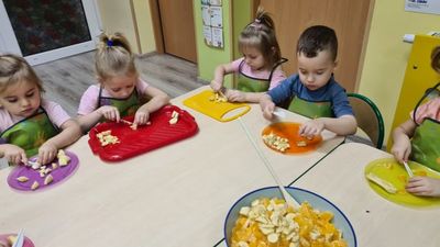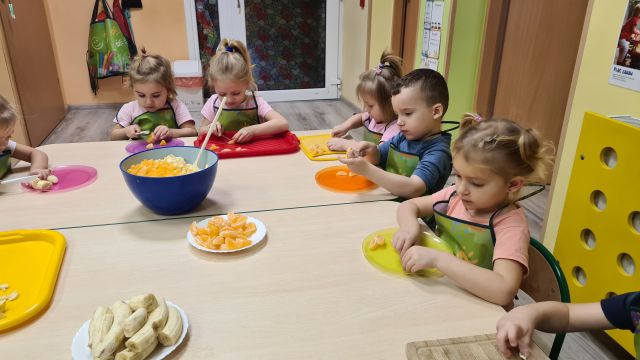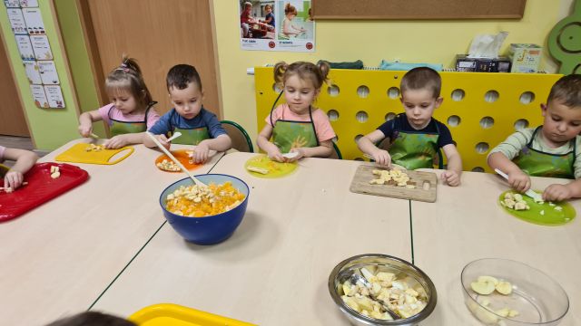 W dniu 01.12.2022 r. w grupie "Krasnali" odbyły się zajęcia dotyczące zdrowych nawyków żywieniowych. Celem zajęć było zachęcenie dzieci do aktywności fizycznej oraz do spożywania zdrowych przekąsek wykonanych z owoców. Po ćwiczeniach fizycznych nadszedł czas na uzupełnienie wartości odżywczych. "Krasnale" rozpoznawały owoce za pomocą swoich zmysłów, następnie przystąpiły do wykonania sałatki owocowej. Wszystkie dzieci z niewielką pomocą pań obierały i kroiły owoce oraz wymieszały składniki w misce. Gdy wszystko było już gotowe "Krasnale" rozpoczęły degustację sałatki. Wszystkim bardzo smakowała, była kolorowa i pyszna. Dzieci postanowiły wykonać taką samą w domu dla swoich rodziców. Zapraszamy do oglądania zdjęć.