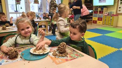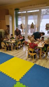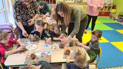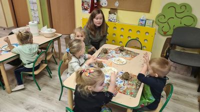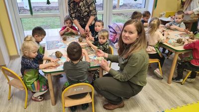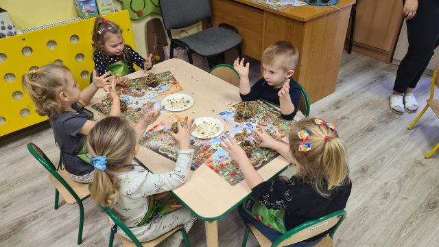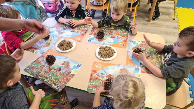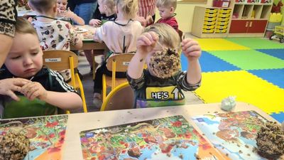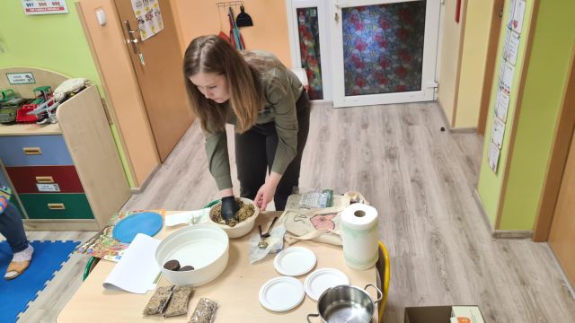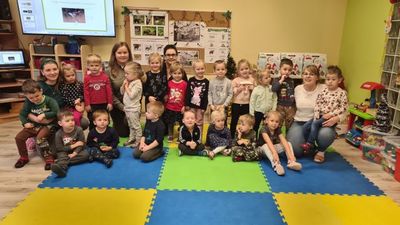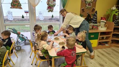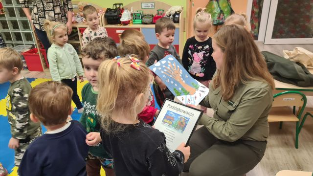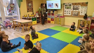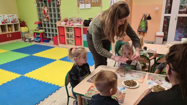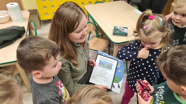 Dnia 07.12.2022 r. grupę ,,Krasnali” odwiedziła pani leśnik z Nadleśnictwa Trzebielino. Celem naszego spotkania było zapoznanie dzieci z różnymi gatunkami ptaków oraz uzyskanie odpowiedzi na pytanie: jak pomóc ptakom w przetrwaniu zimy. Dzieci zapoznały się z przepisem – jak zrobić wiszące kule – ,,pyzy”. Każde dziecko własnoręcznie wykonało przysmak – domową stołówkę, którą zabrało do domu. Przedszkolaki z dużym zainteresowaniem słuchały opowieści o mieszkańcach lasu. Na zakończenie otrzymały gry edukacyjne o lesie. Z całą pewnością od dzisiaj w przydomowych ogródkach naszych „Krasnali” zauważymy karmnik i rozpocznie się sezon odpowiedzialnego dokarmiania ptaków. Spotkanie upłynęło w miłej atmosferze, a wysłuchane ciekawostki i wiadomości poszerzyły wiedzę przyrodniczą przedszkolaków. Dziękujemy za spotkanie. Zapraszamy do galerii.
