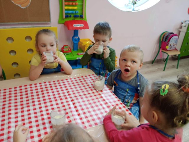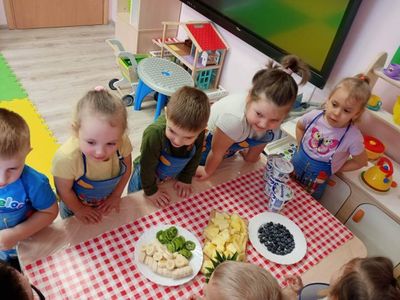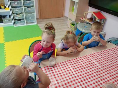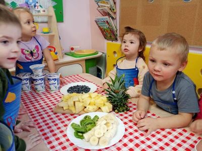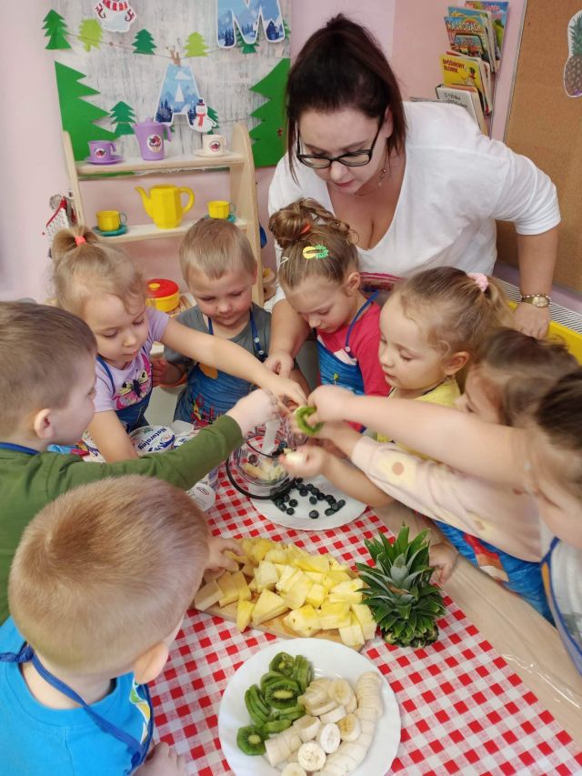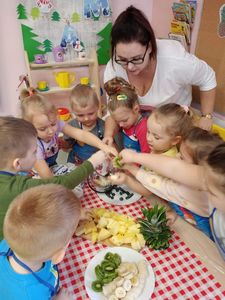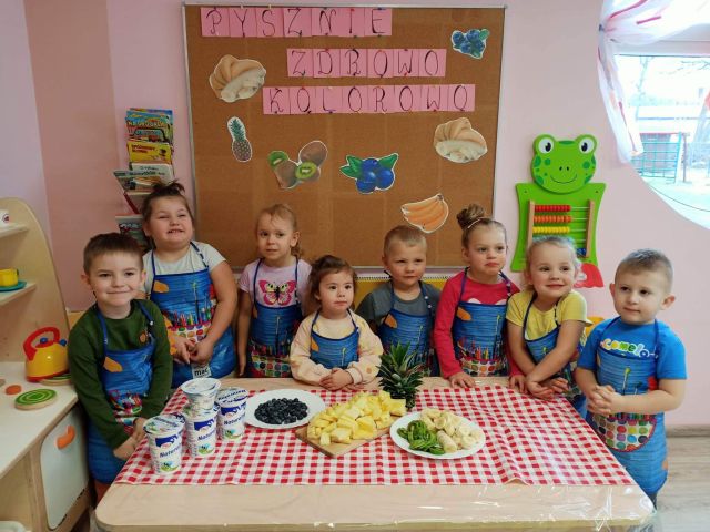 15 lutego dzieci z grupy ,,Żabki" z myślą o witaminkach i zdrowym odżywianiu przygotowały koktajl owocowy z bananów, kiwi, borowki amerykańskiej i ananasa. Przed przystąpieniem do pracy umyły rączki i założyły fartuszki. Gotowe do pracy zaczęły wrzucać owoce do blendera. Celem zajęć było zachęcenie dzieci do spożywania owoców i zapoznanie przedszkolaków z możliwością spożywania owoców w innej postaci. Na koniec wszystkich czekała degustacja.