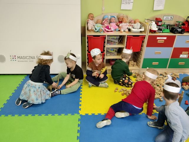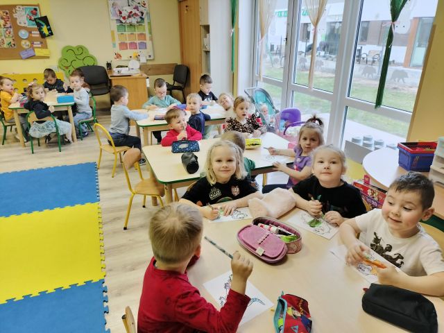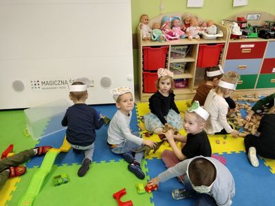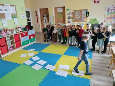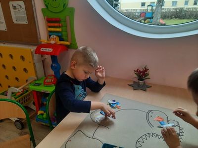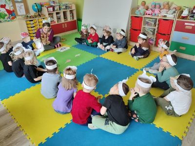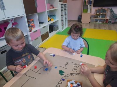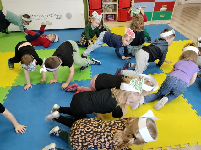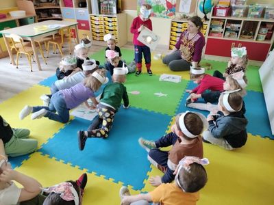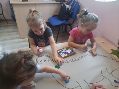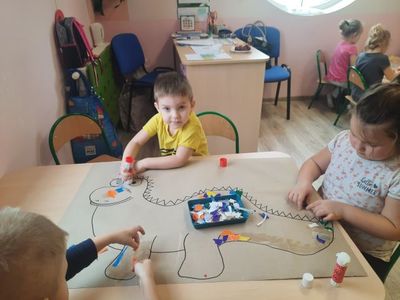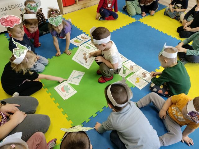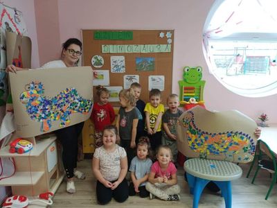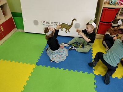 Natomiast Żabki wysłuchały opowiadania o dinozaurach, a potem chętnie brały udział w zabawie muzyczno-ruchowej ,,Dinozaury szukają swojej rodziny". Dzieci klasyfikowały również dinozaury na małe i duże, nauczyły się piosenki ,,Dino, dino, dinozaur" oraz wykonały pracę plastyczną w dwóch grupach - wykleiły wycinanką sylwetę dinozaura. Na koniec przedszkolaki otrzymały pamiątkowe medale.