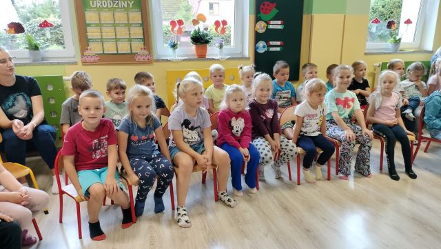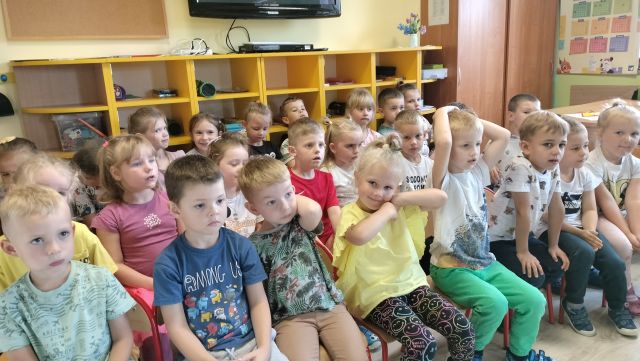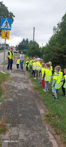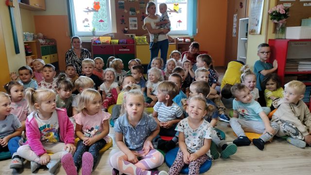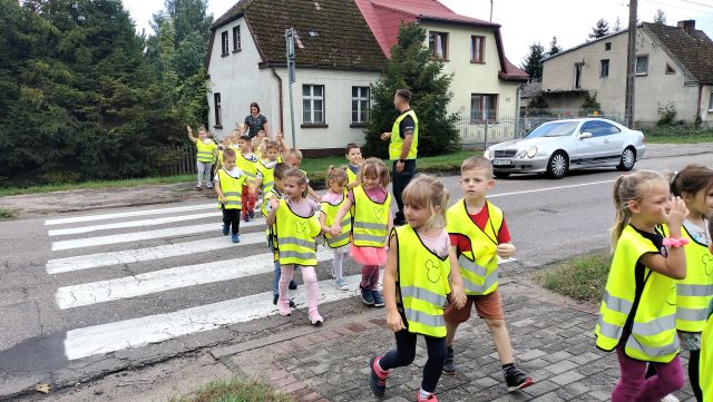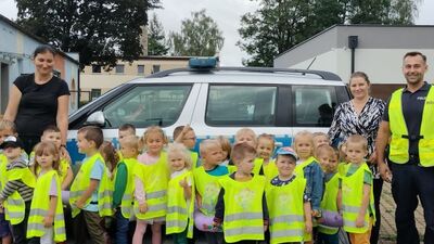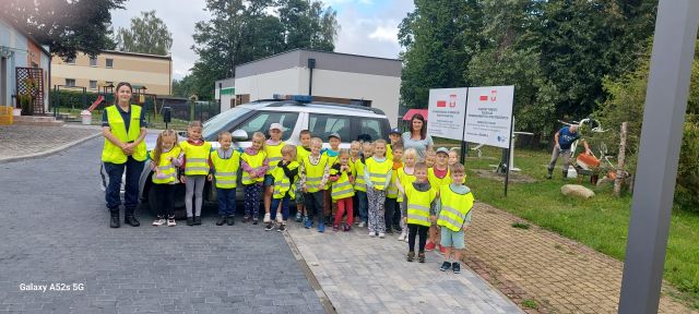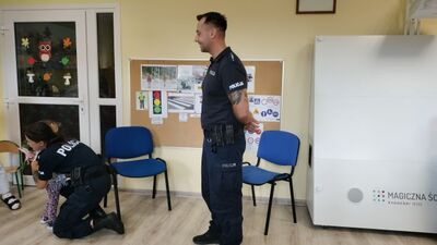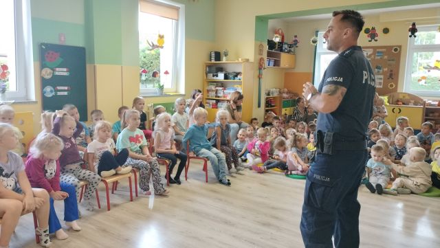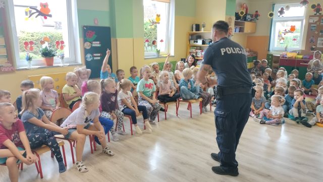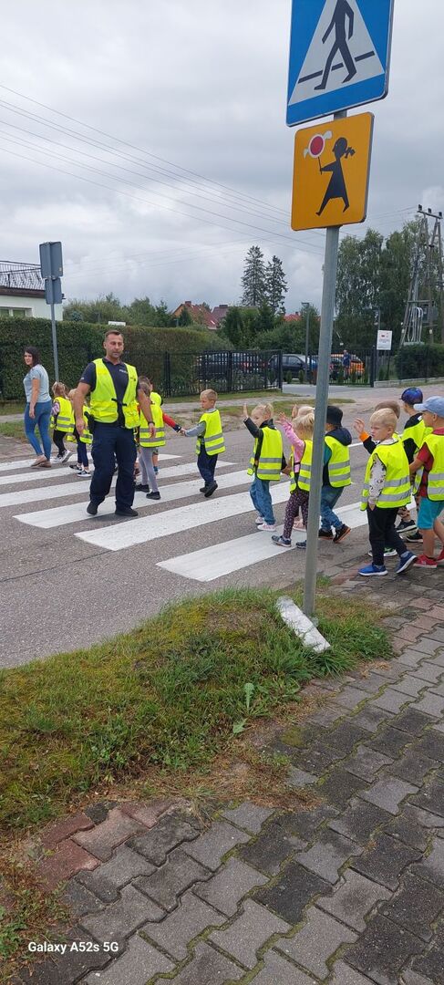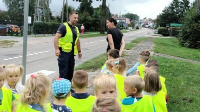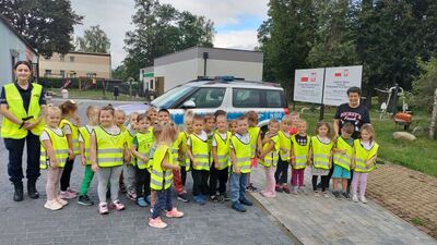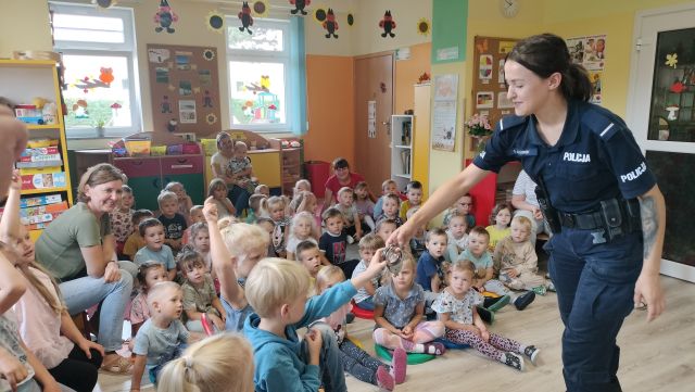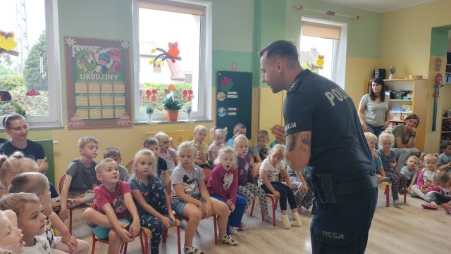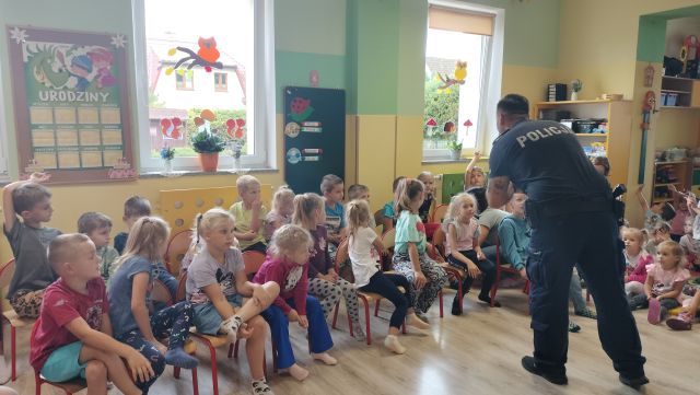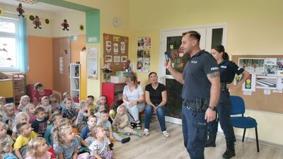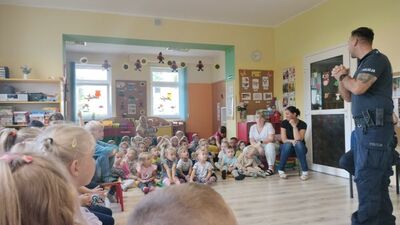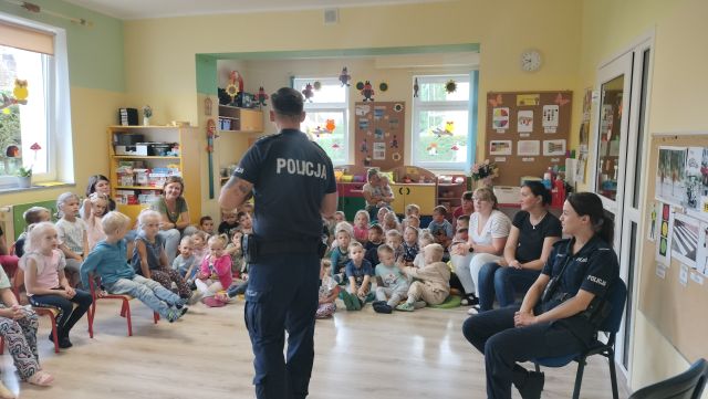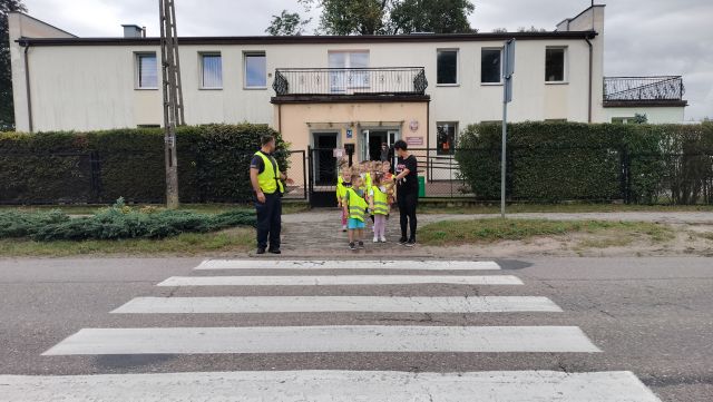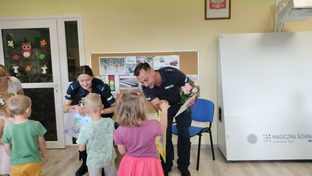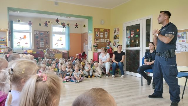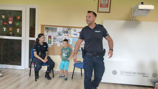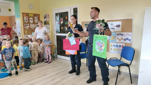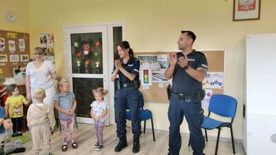 Dziś nasze przedszkole odwiedzili policjanci: starsza posterunkowa Samuela i aspirant Mateusz, którzy przybliżyli dzieciom podstawowe zasady bezpiecznego poruszania się chodnikiem i przejściem dla pieszych. Dzieci otrzymały wskazówki, jak zachować sie w sytuacji spotkania osoby obcej. Policjanci przypomnieli również o korzyści noszenia ubrań i obuwia posiadającego elementy odblaskowe. Jednak największym zainteresowaniem cieszyła się prezentacja wyposażenia policyjnego, niezbędnego podczas wykonywania pracy policjanta. Dzieci dzieliły sie także swoimi doświadczeniami, pokazały, że są odpowiedzialne i wiedzą, jak należy sie zachowywać na drodze i w najbliższym otoczeniu. Dziękujemy za przypomnienie nam zasad bezpieczeństwa.