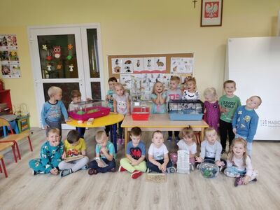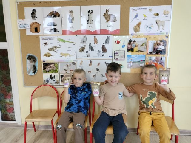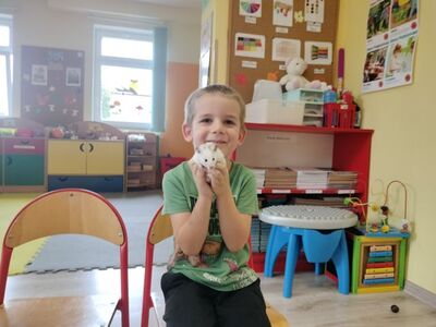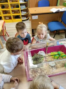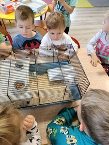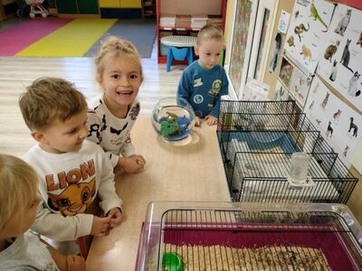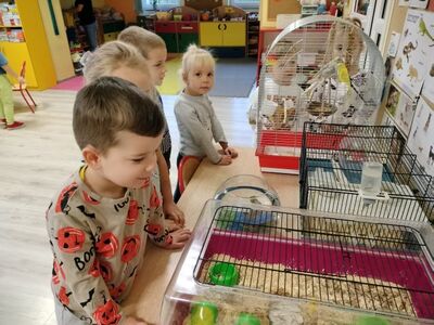 W tym tygodniu grupa Biedronek rozmawiała o zwierzętach domowych. Poznaliśmy ich nazwy, zwyczaje oraz zasady prawidłowej opieki. Chętne dzieci przyniosły do przedszkola własne pupile, co wywołało duże poruszenie i uśmiech na twarzach wszystkich przedszkolaków. Odwiedziły nas papużki: Gwiazdka, Malinka i Chmurka; dwie małe myszki: Leon i Halinka, rybka Blue, a także chomik i żółw. Dzieci prezentowały swoje zwierzątka i opowiadały o ich przysmakach. Odważne Biedroneczki trzymały chomika i dotykały skorupę żółwia.