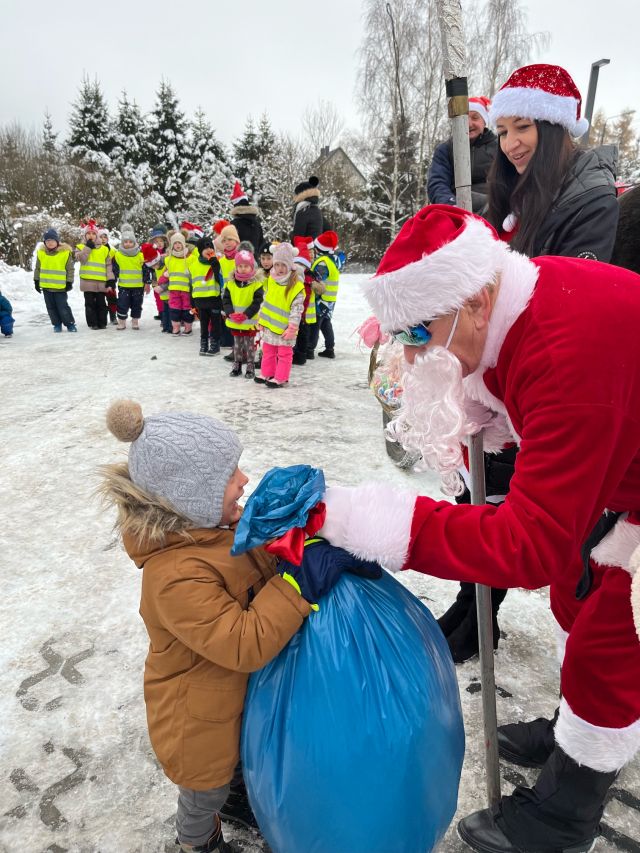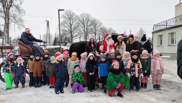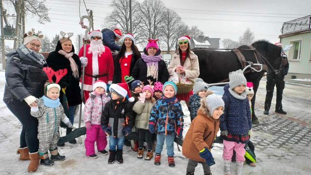 Wizyta Mikołaja w przedszkolu to najbardziej oczekiwany przez dzieci dzień w roku. Nasze przedszkolaki od rana nasłuchiwały dzwoneczków Mikołaja, który nie zawiódł i przybył wozem ciągniętym przez ogromnego konia. W przepięknej ośnieżonej scenerii wszystkie dzieci podziwiały umiejętności woźnicy, urodę Śnieżynek - pomocnic Mikołaja, niektórzy odważyli sie zadać pytania naszemu Gościowi z dalekiej Północy. A w salach na wszystkich czekały upominki, słodkości i wspaniała zabawa.