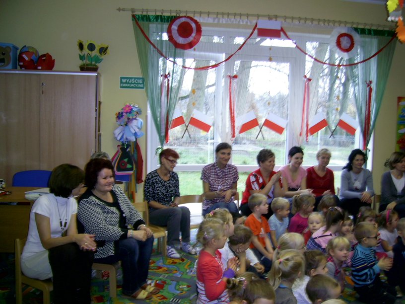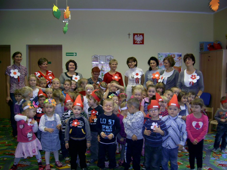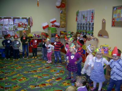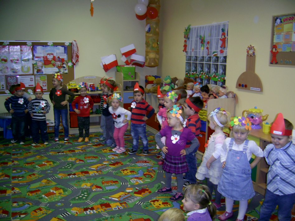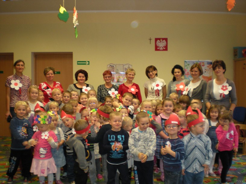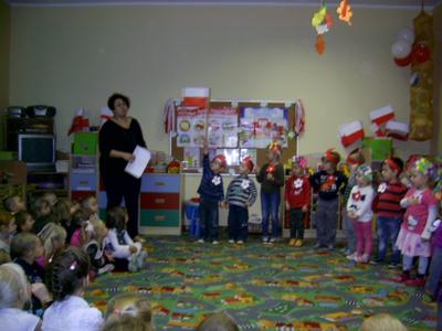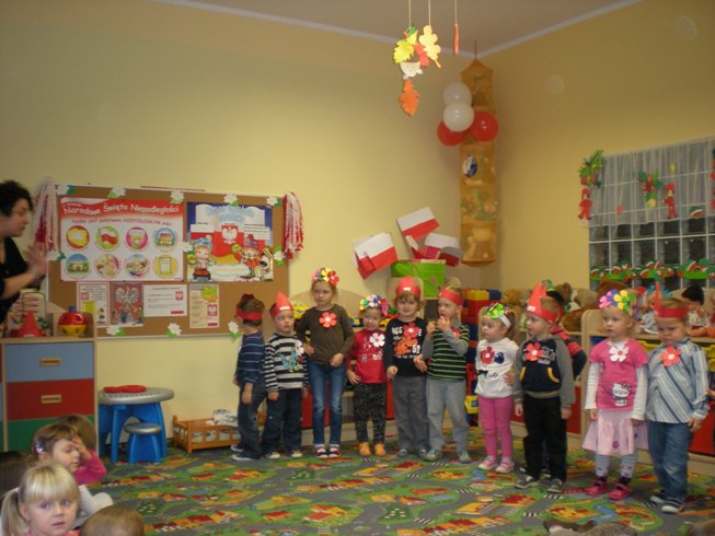 Dnia 9 listopada 2013 r. ,,Krasnale” przygotowane przez Panią Kasię zaprezentowały w przedszkolu program artystyczny z okazji Święta Odzyskania Niepodległości przez naszą Ojczyznę. Podczas występu dzieci zaprezentowały wzruszające wiersze dotyczące historii naszej Ojczyzny oraz zatańczyły do piosenki „Przybyli ułani pod okienko”. Zaś z zaproszonymi gośćmi pięknie i z sercem wyśpiewały pieśń „Mazurek Dąbrowskiego”. Wspólne świętowanie po raz kolejny pokazało nam, jak wiele radości i entuzjazmu budzi się, zarówno w najmłodszych jak i starszych Polakach, podczas śpiewania i recytowania tych pięknych związanych z naszą historią utworów.