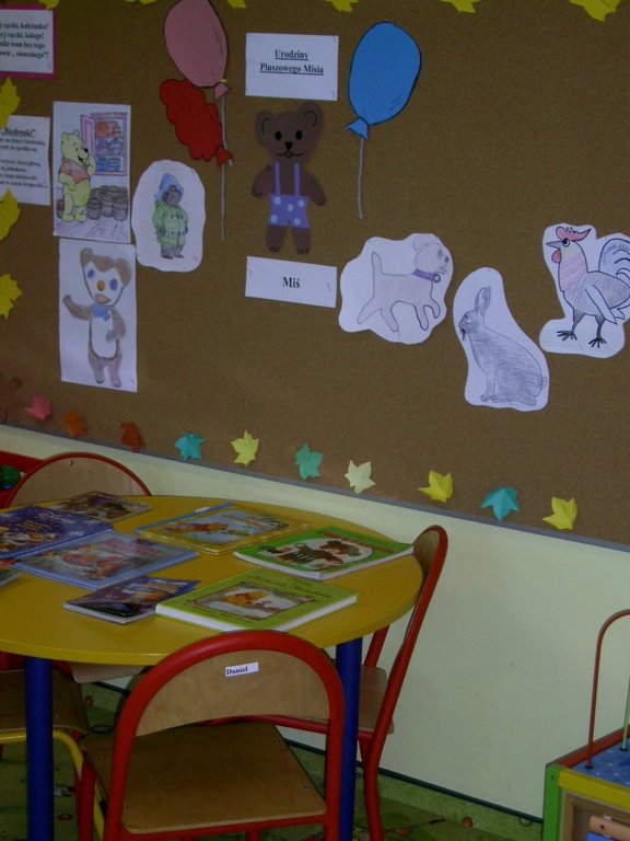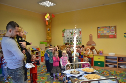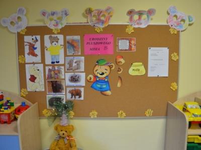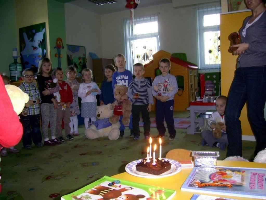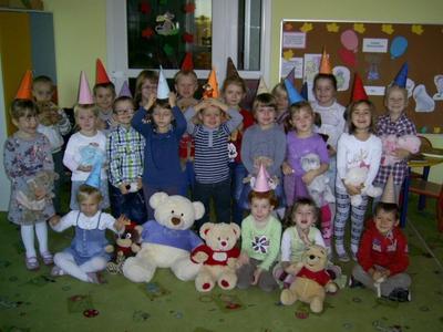 25.11.2013r. wszystkie przedszkolaki z Gminnego Przedszkola w Kołczygłowach kroczyły żwawo w stronę placówki z ukochanymi misiami. Były małe, duże, niektóre bez ucha, nowo kupione i te nieco starsze. Jednak to nie było ważne…. Każdy miś miał imię i jakąś historię, a przede wszystkim był kochany przez dzieci. Tego dnia w przedszkolu odbyły się urodziny Pluszowego Misia. Krasnale zaprosiły na tę uroczystość Panią Dyrektor i swoich rodziców. Przybyło wielu gości. Wszyscy świetnie się bawili. Średniaki w tym dniu także przyniosły z domu ulubionego misia i książkę o misiach. Zabawa była znakomita, wszystkim dopisywał dobry humor, nie brakowało także " małego co nieco". Dzieci samodzielnie przygotowywały mini torciki. Na koniec zajadały " kubusiowe ciasto" upieczone przez mamę Ali. K. Dziękujemy, szkoda, że urodziny misia są tylko raz w roku.