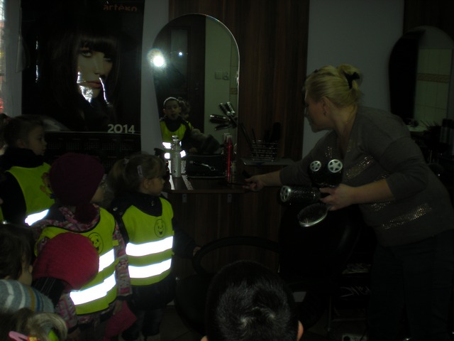 Dzieci z grupy ,,Misiaki” 5-6 latki wraz ze swoja wychowawczynią 27. 02. 2014 roku były z wizytą w zakładzie fryzjerskim. W trakcie spotkania zobaczyły z bliska na czym polega praca pani fryzjerki oraz jakie przybory i sprzęty są potrzebne do wykonania fryzury. Wśród dzieci nie zabrakło chętnych do tego, aby usiąść na fotelu fryzjerskim i służyć jako model. Dzięki temu spotkaniu dzieci są bogatsze o wiedzę i doświadczenia.