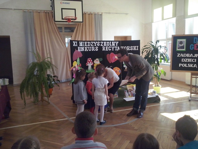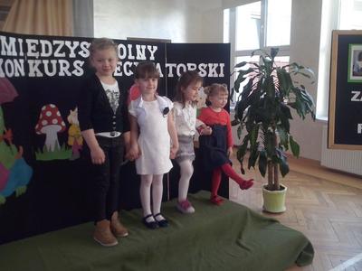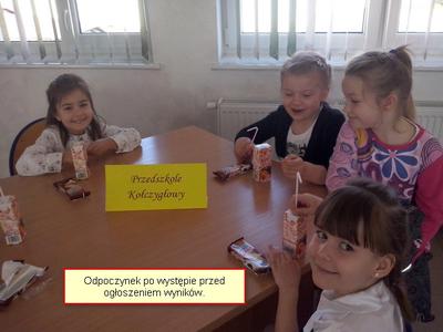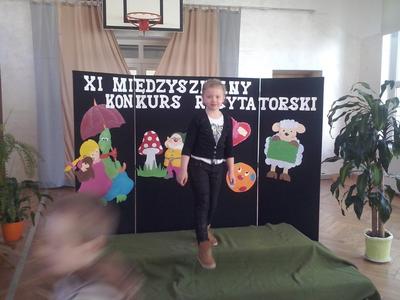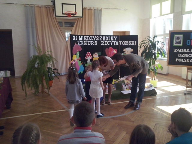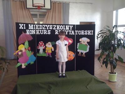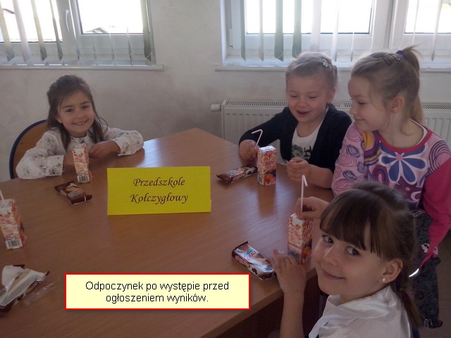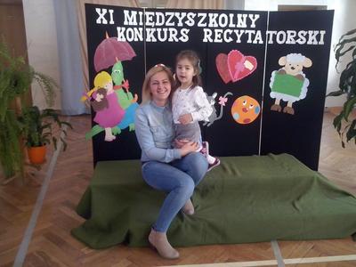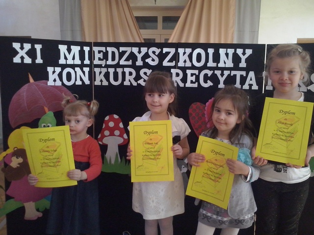Dnia 31. 03. 2014 roku dzieci z naszego przedszkola brały udział w XI Konkursie Recytatorskim organizowanym przez Zespół Szkół w Kołczygłowach. Prezentowały wiersze Doroty Gellner. Lilianna T. recytowała wiersz ,,Idzie kot", Helenka Cz. ,,Kwiatki - bratki", Wiktoria S. wiersz pt. ,,Mój sen" natomiast Alicja B. wiersz ,,W ogródku". Za recytację dzieci otrzymały dyplomy oraz upominki. Brawo przedszkolaki za odwagę, pokonanie tremy i udaną recytację.