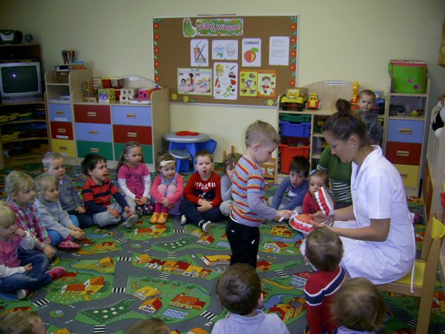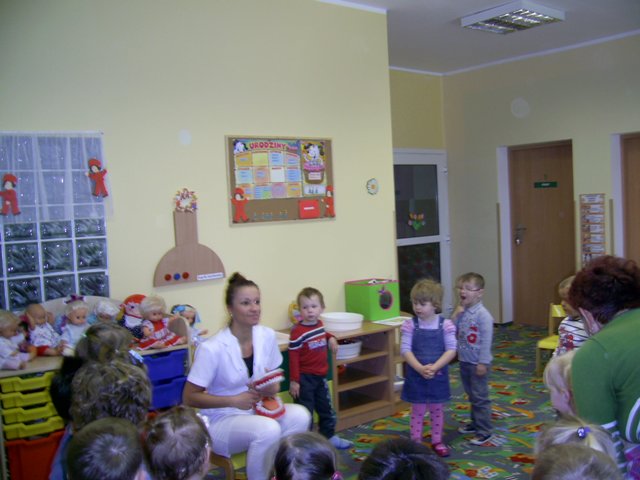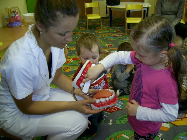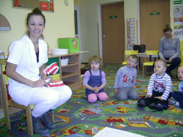 Zdrowe zęby mam, bo o nie dbam - to temat zajęcia otwartego dla rodziców, które odbyło się dnia 31.03.14r. W tym dniu dzieci z grupy najmłodszej gościły nie tylko rodziców, ale też p. dyrektor oraz szczególnego gościa p. Amelię Urban- lekarza stomatologa. Zaprosiliśmy panią stomatolog, by dowiedzieć się jak najwięcej o tym, jak prawidłowo szczotkuje się ząbki, jak się odżywiać, by nie szkodzić zdrowiu i zębom, czego unikać powinny dzieci w codziennej diecie. Jeszcze przed śniadaniem pani Danusia ścięła wyhodowaną w naszym zielonym ogródku rzeżuchę, którą dzieci zjadły podczas poniedziałkowego śniadania. Powiedzieliśmy o tym pani dentystce i nas za to pochwaliła. Maluszki wiedzą, że ta niepozorna roślinka ma właściwości zdrowotne. Jest źródłem potrzebnych naszemu organizmowi witamin - zwłaszcza witaminy C - i mikroelementów. Może nie wszystkie dzieci wiedzą, ale dawniej rzeżucha stosowana była m.in. do dezynfekowania jamy ustnej. Pani stomatolog w bardzo prosty, przystępny i obrazowy sposób udzieliła maluszkom cennych wskazówek dotyczących prawidłowego mycia zębów. Po tych cennych radach przeszliśmy do naszej przedszkolnej łazienki, by pokazać uczestnikom naszego spotkania, jak dzieci radzą sobie z ich szczotkowaniem. To była świetna zabawa, szczoteczka tańczyła, szorowała ząbki, wymiatała to, co nie potrzebne. Na pożegnanie pani dentystka wręczyła dzieciom kolorowanki i sprawdziła stan uzębienia. A my podziękowaliśmy jej kwiatkami i piosenką. Grupa "Krasnali " codziennie po przedszkolnym śniadaniu będzie starannie myć zęby wiedząc, że higiena jamy ustnej jest jedną z najważniejszych metod zapobiegania próchnicy.
