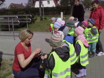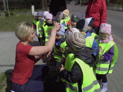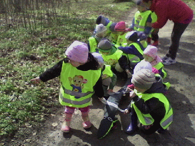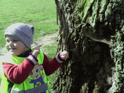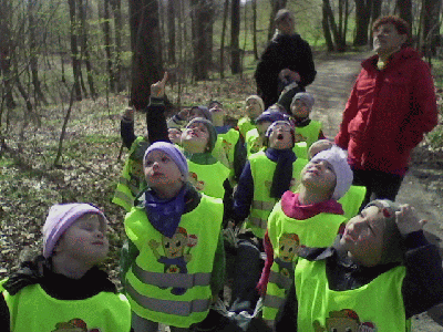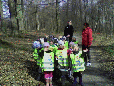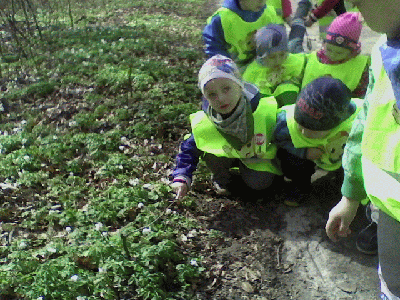 Piękny wiosenny poranek (czwartek 17 kwiatnia) wybrały Krasnale na spacer do pobliskiego parku. Dzieci przeprowadziły pierwsze obserwacje przyrodnicze: znalazły zawilce, porosty i mchy oraz dokładnie przyjrzały się odważnej sójce. Na ścieżce prowadzącej do parku odkryliśmy ślady racic sarny! Ale największą niespodzianką było spotkanie Misiaków - starszaków :)