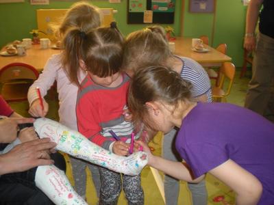 Dnia 30 kwietnia 2014 roku w naszym przedszkolu mieliśmy przyjemność gościć Kubę oraz jego rodziców. Całe nasze przedszkole zbiera nakrętki po napojach i sokach, aby wspomóc Kubę w rehabilitacji. Dzieci miały okazję podpisać się na gipsie chłopca kolorowymi mazakami. Serdecznie dziękujemy gościom za odwiedziny i zapewniamy, że dalej będziemy brać udział w akcji.