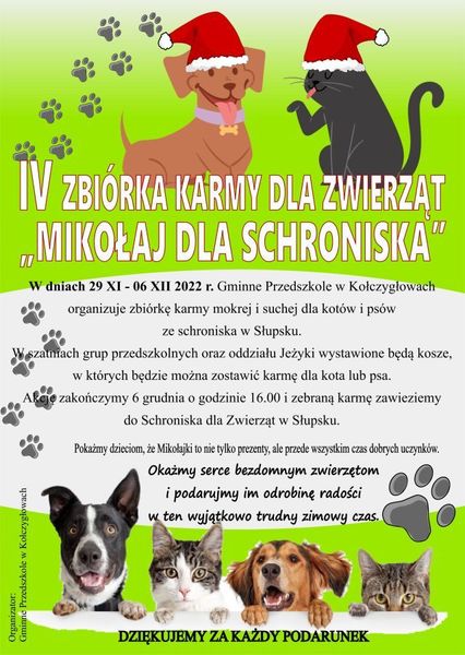 27 listopada 2022 Aktualności Rozpoczynamy akcję przedszkolaków "Mikołaj dla schroniska"! Zapraszamy i zachęcamy wszystkie osoby, którym na sercu leży dobro zwierząt, do przyłączenia się i wsparcia akcji przedszkolaków "Mikołaj dla schroniska". W dniach 27 listopada - 6 grudnia... Czytaj więcej